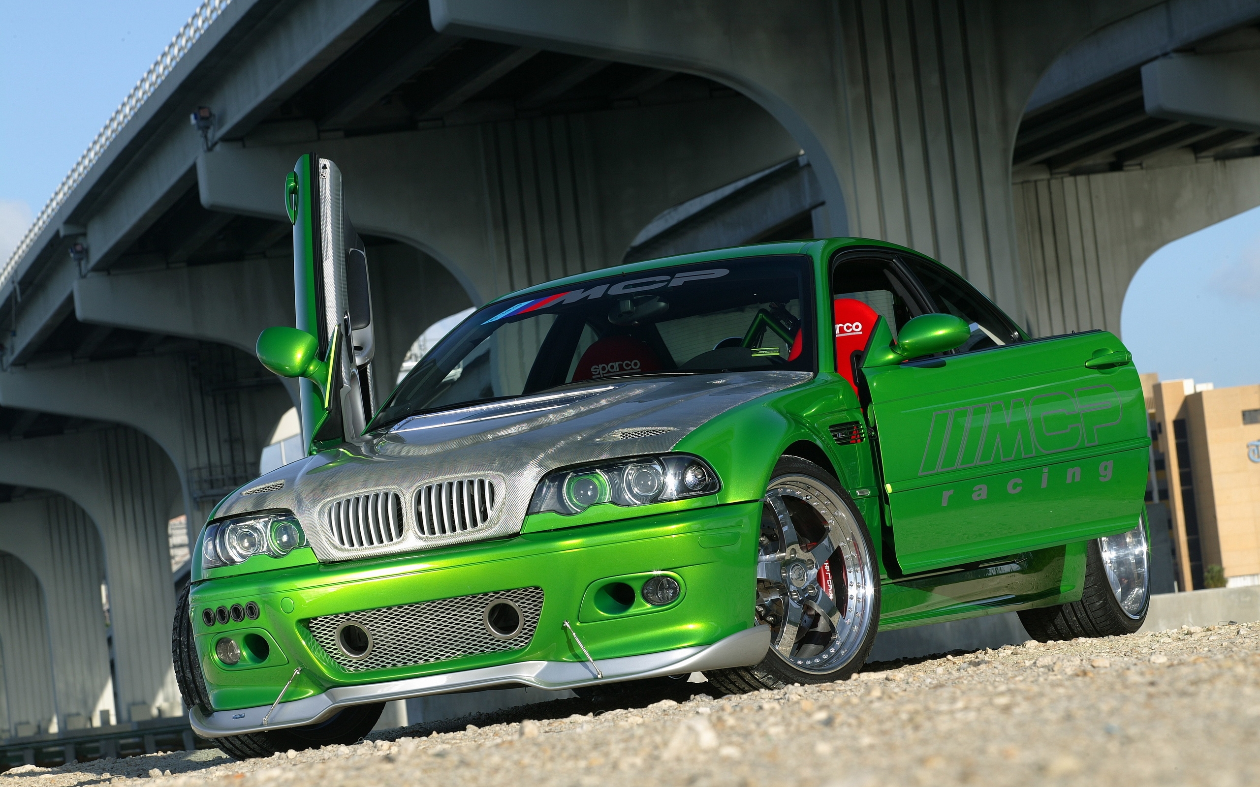 Description: A green car parked in front of a bridge with a red door and a red light on it's side.