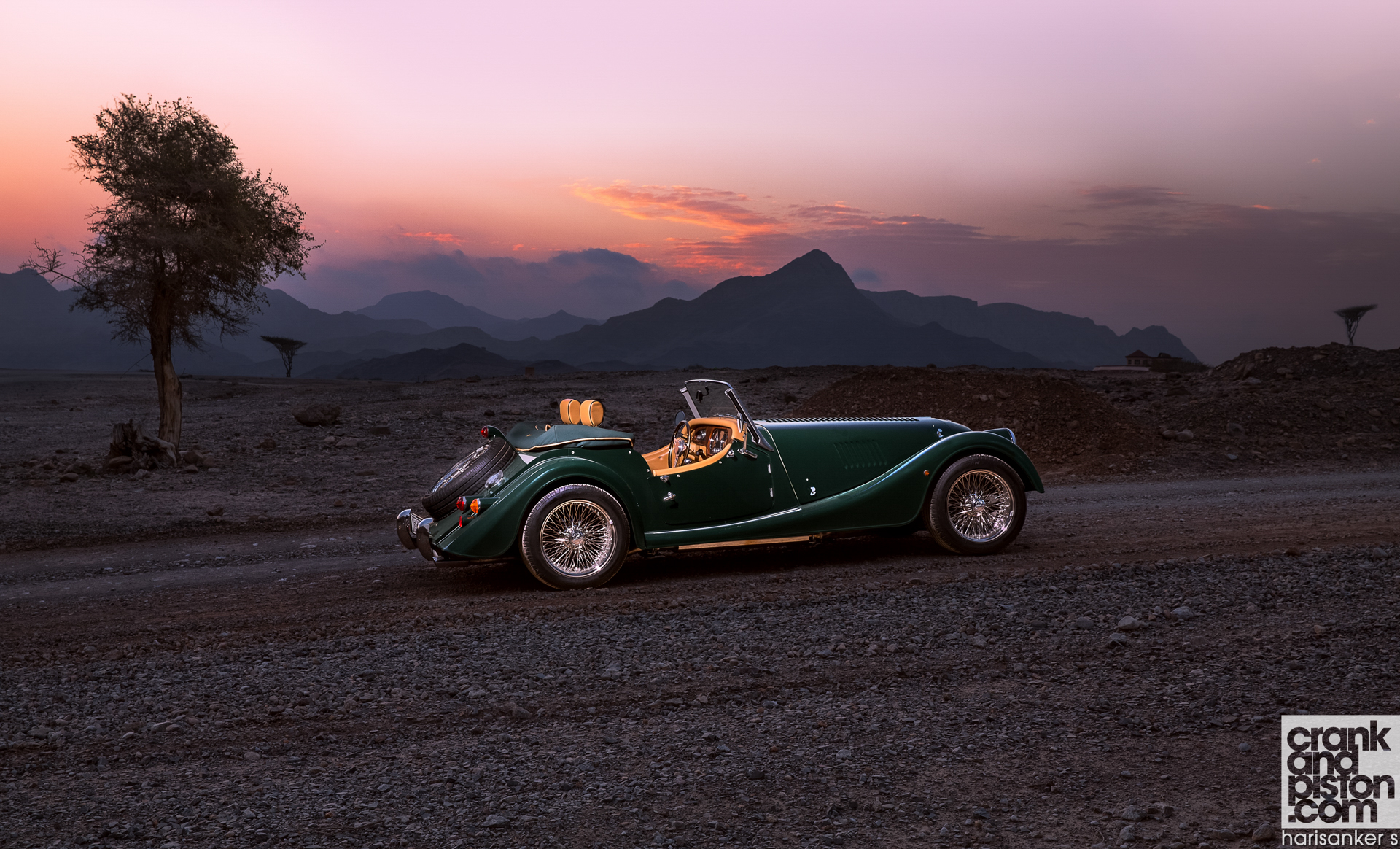Description: A green car parked on a dirt road in the desert at sunset with a tree in the background and a pink sky.