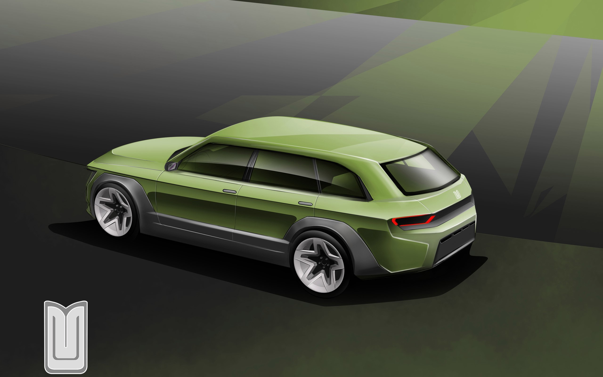 Description: A green car is shown in a graphic style with a black background and a green background with a white stripe.