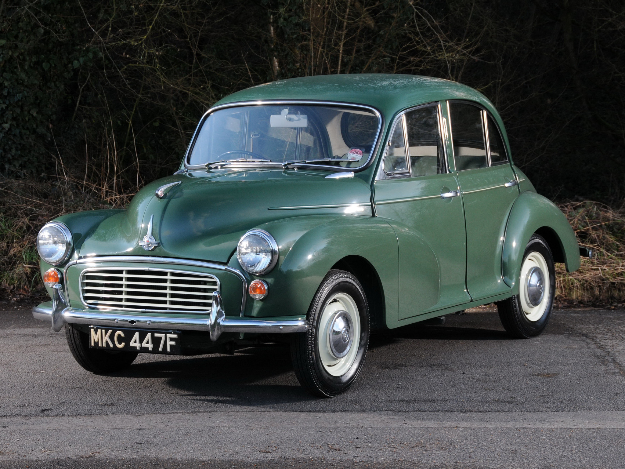 Description: A green car parked in a parking lot next to a forest of trees and bushes in the background.