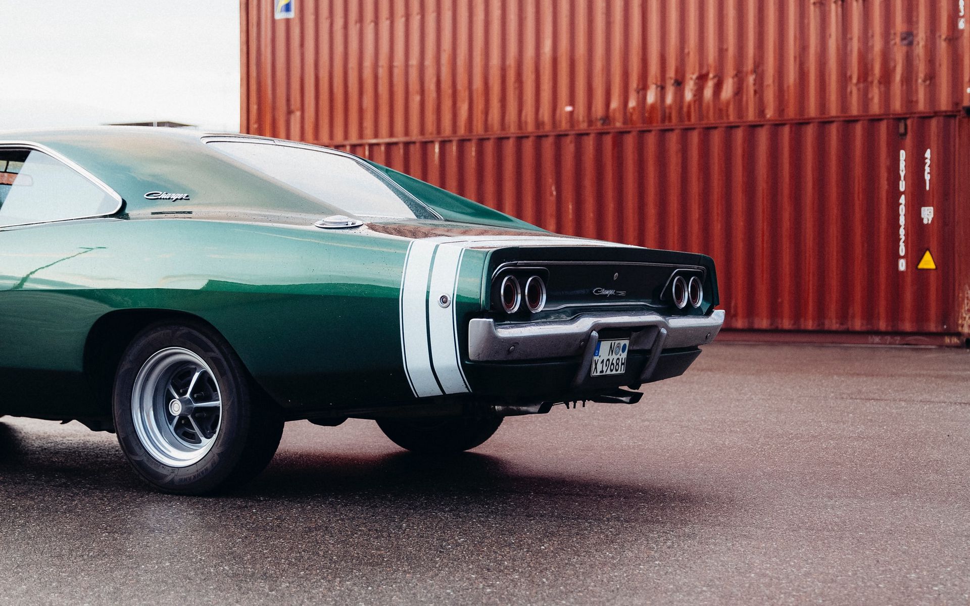 Description: A green car parked in front of a red building with a red wall behind it and a red container behind it.