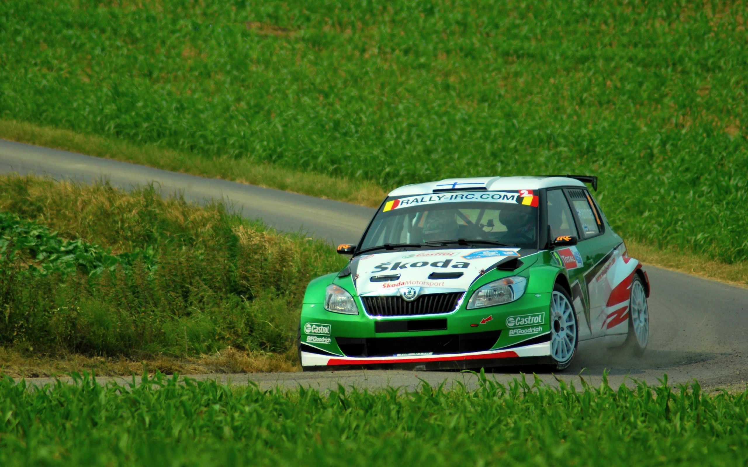 Description: A green car driving down a road next to a lush green field of grass and a road sign that says speed.