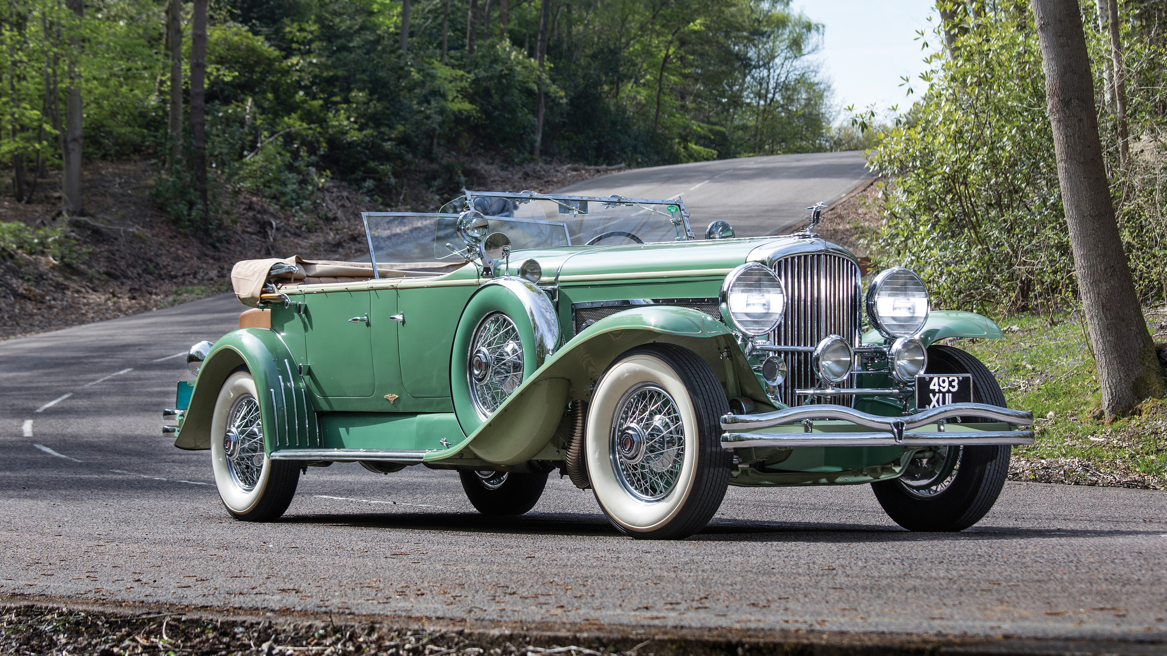 Description: A green car driving down a road next to a forest filled with trees and bushes on a sunny day.