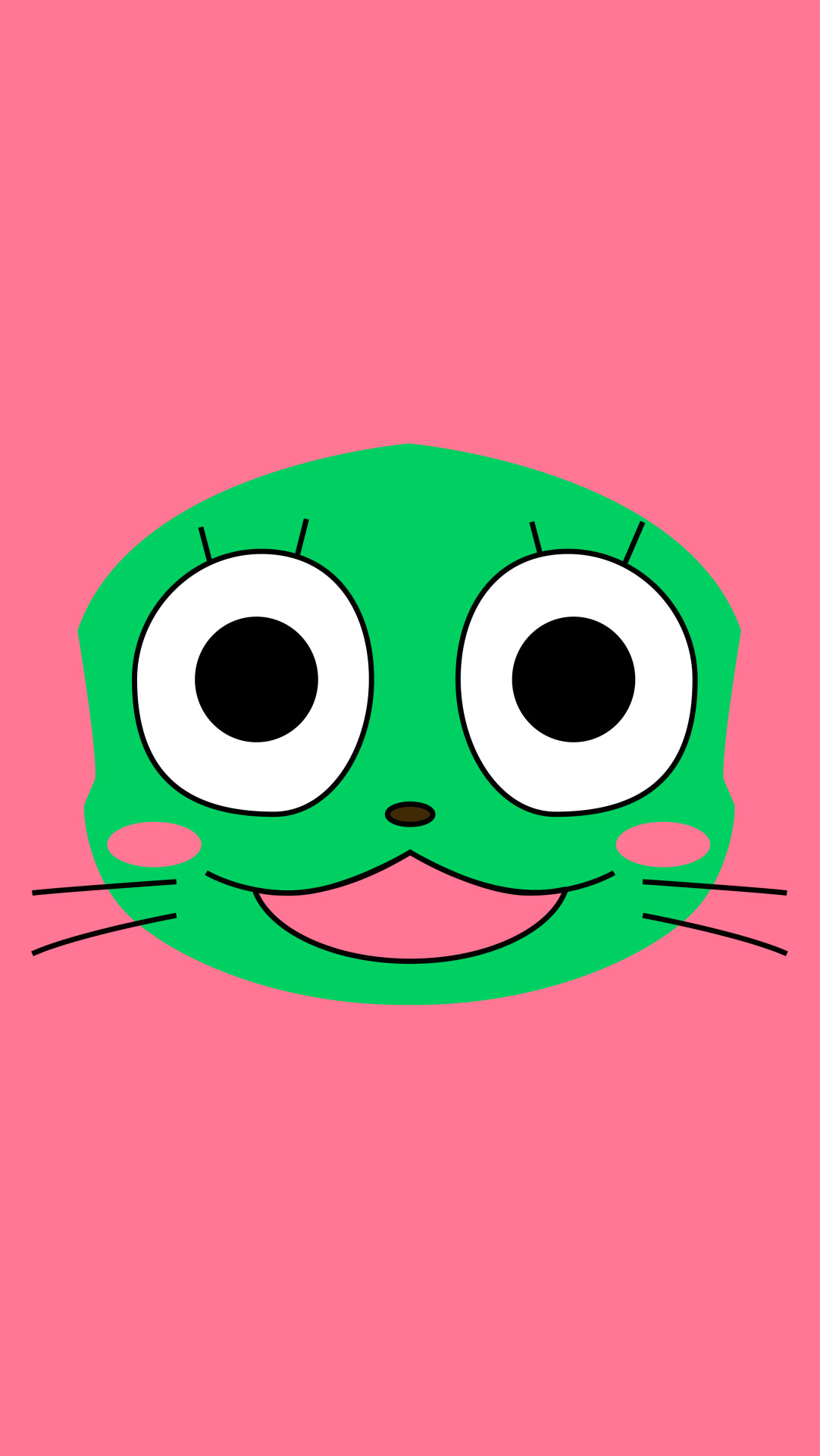 Description: A green cat with big eyes and a pink background with a pink background and a pink background with a green cat with big eyes.
