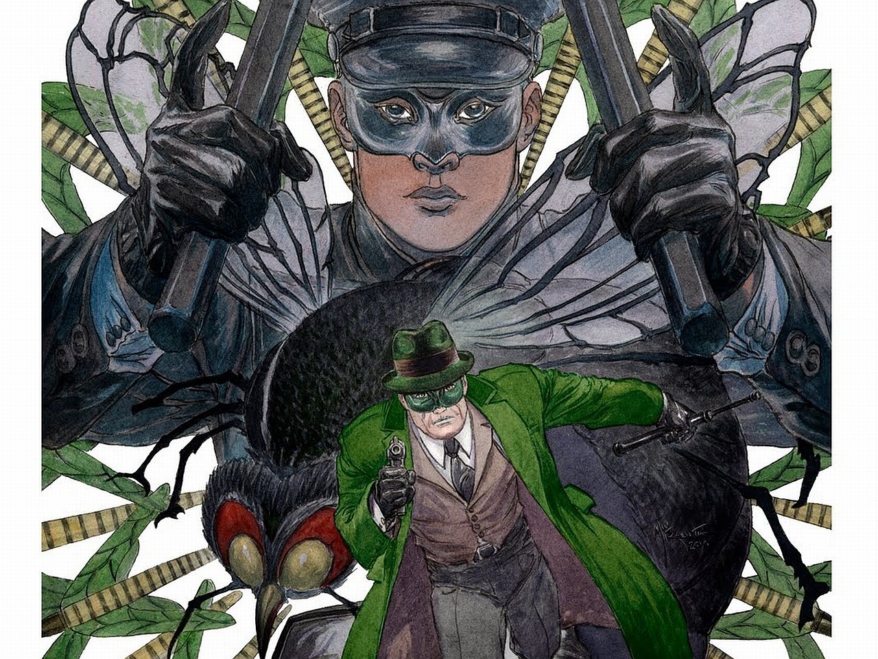 Description: A man in a green coat and hat holding two guns and a bird on his shoulder with a green hat on.