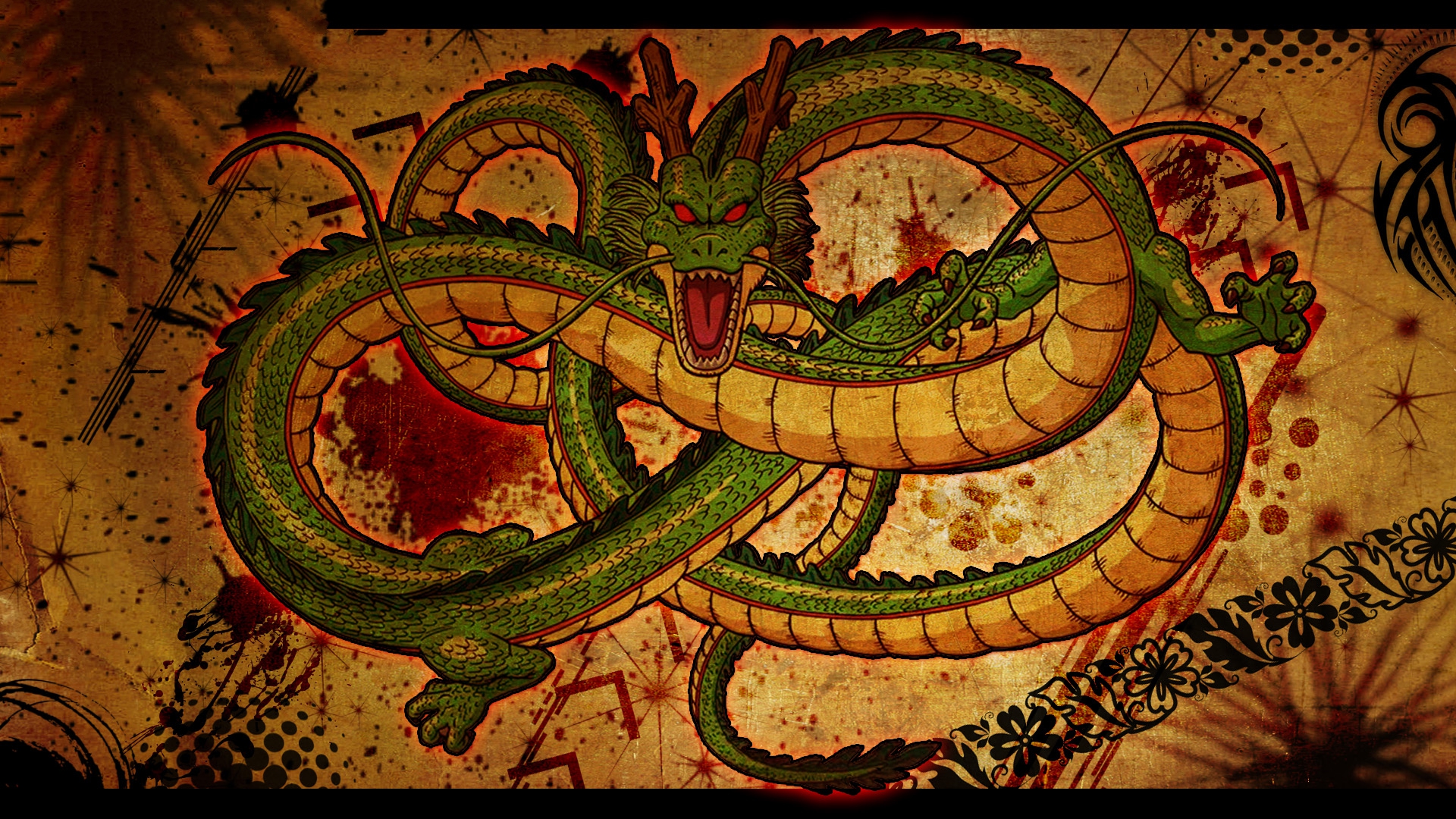 Description: A painting of a green dragon with red eyes and a black tail on a wall with a red and black design.