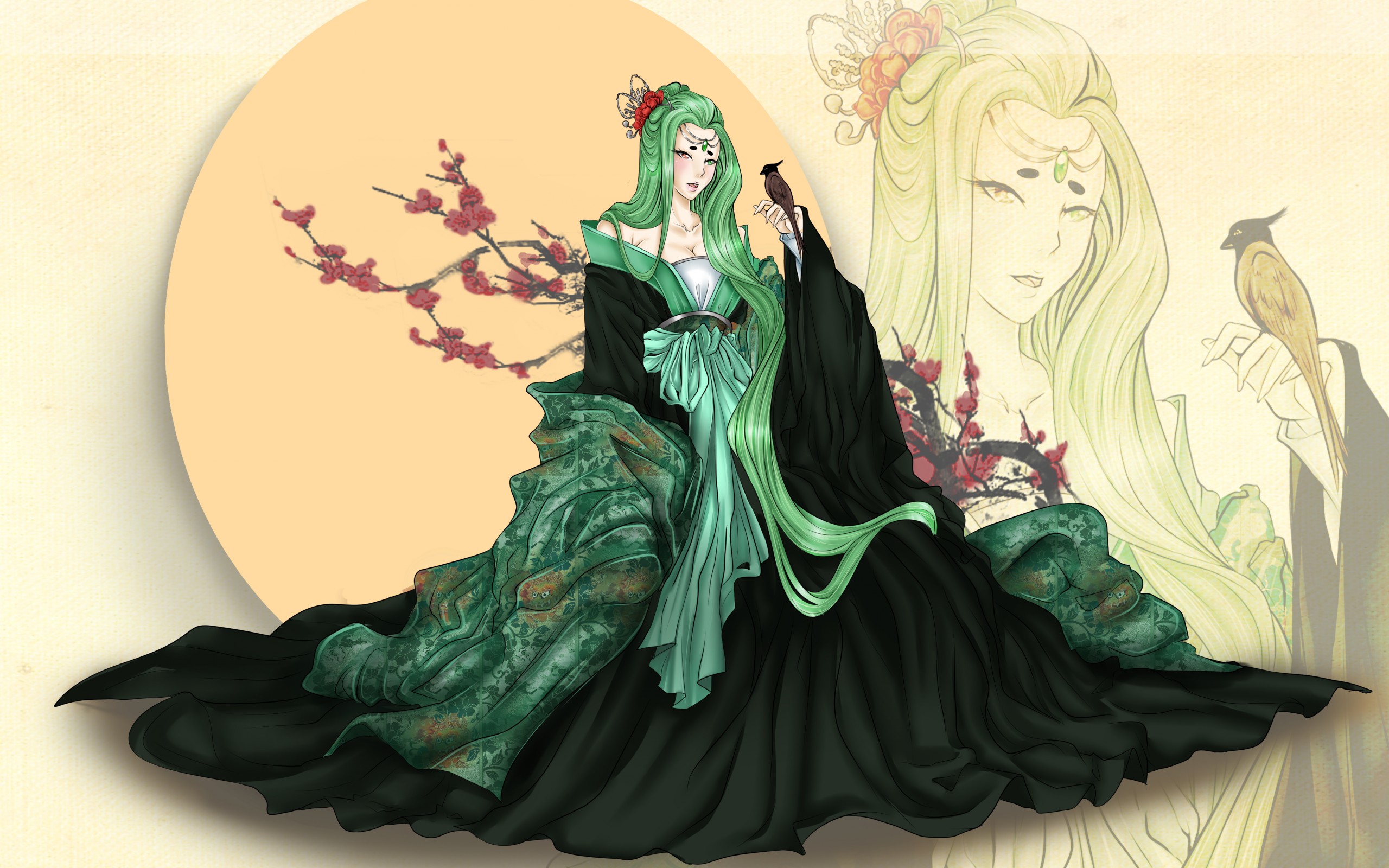 Description: A woman in a green dress with a bird on her shoulder and a bird on her shoulder.