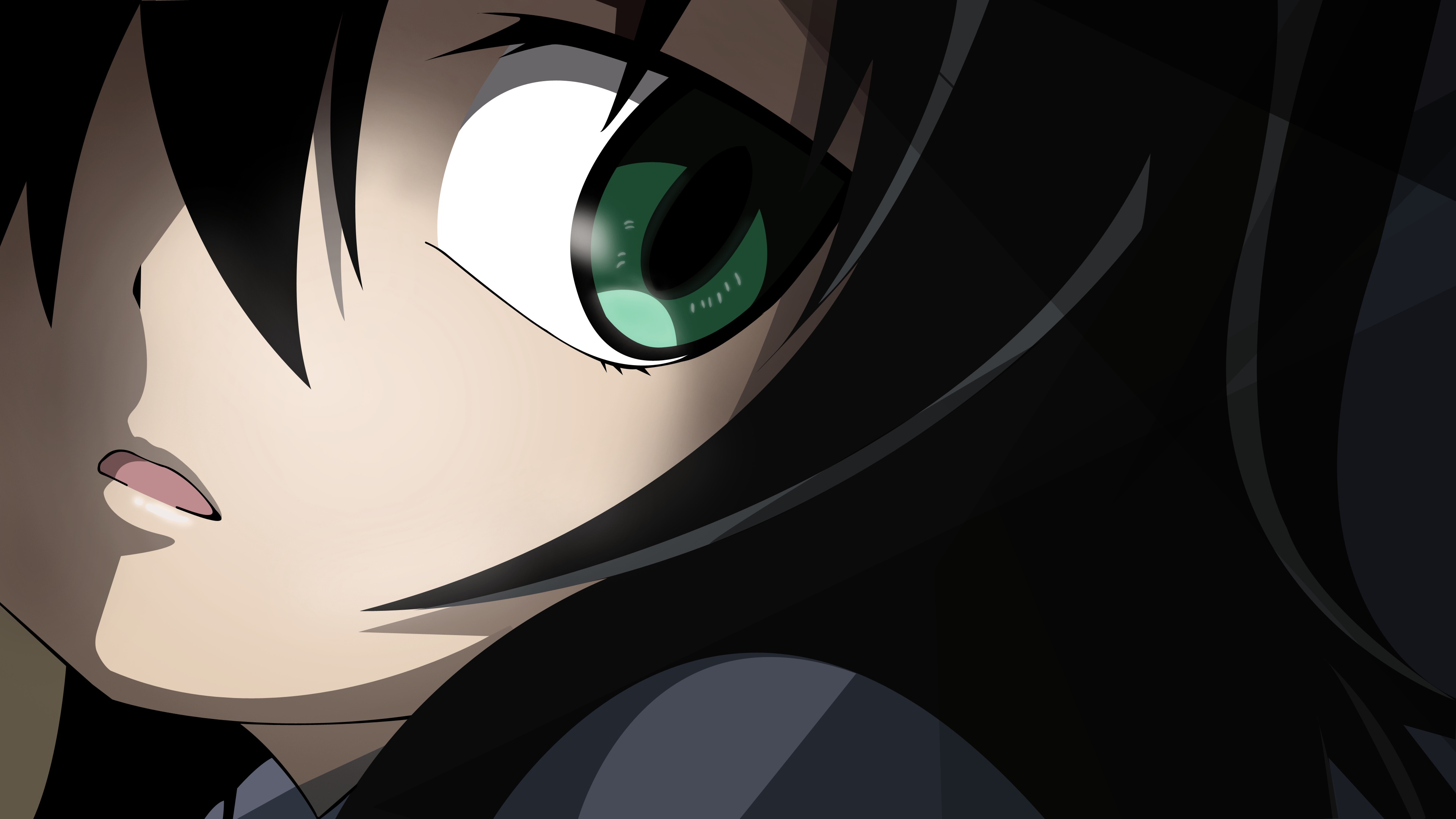 Description: A close up of a person with green eyes and black hair with a black background and a green eye.