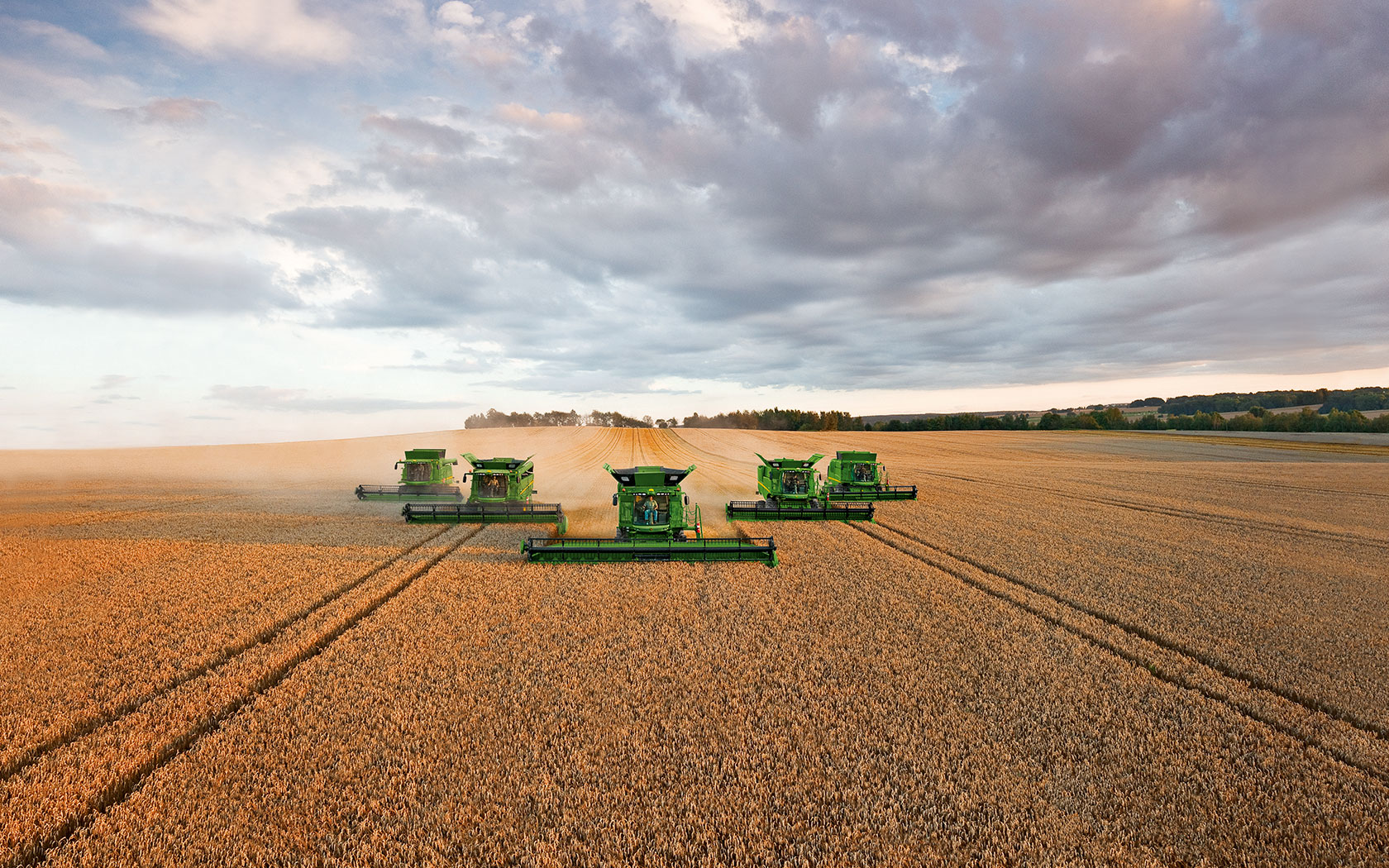 Description: A group of green farm equipment in a field of wheat under a cloudy sky with clouds above it and a few green tractors.