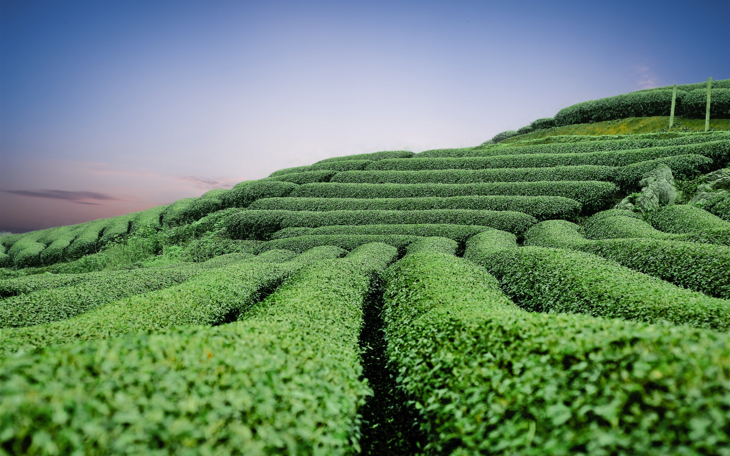 Description: A large green field with a very long row of bushes on top of it and a sky background with a few clouds.