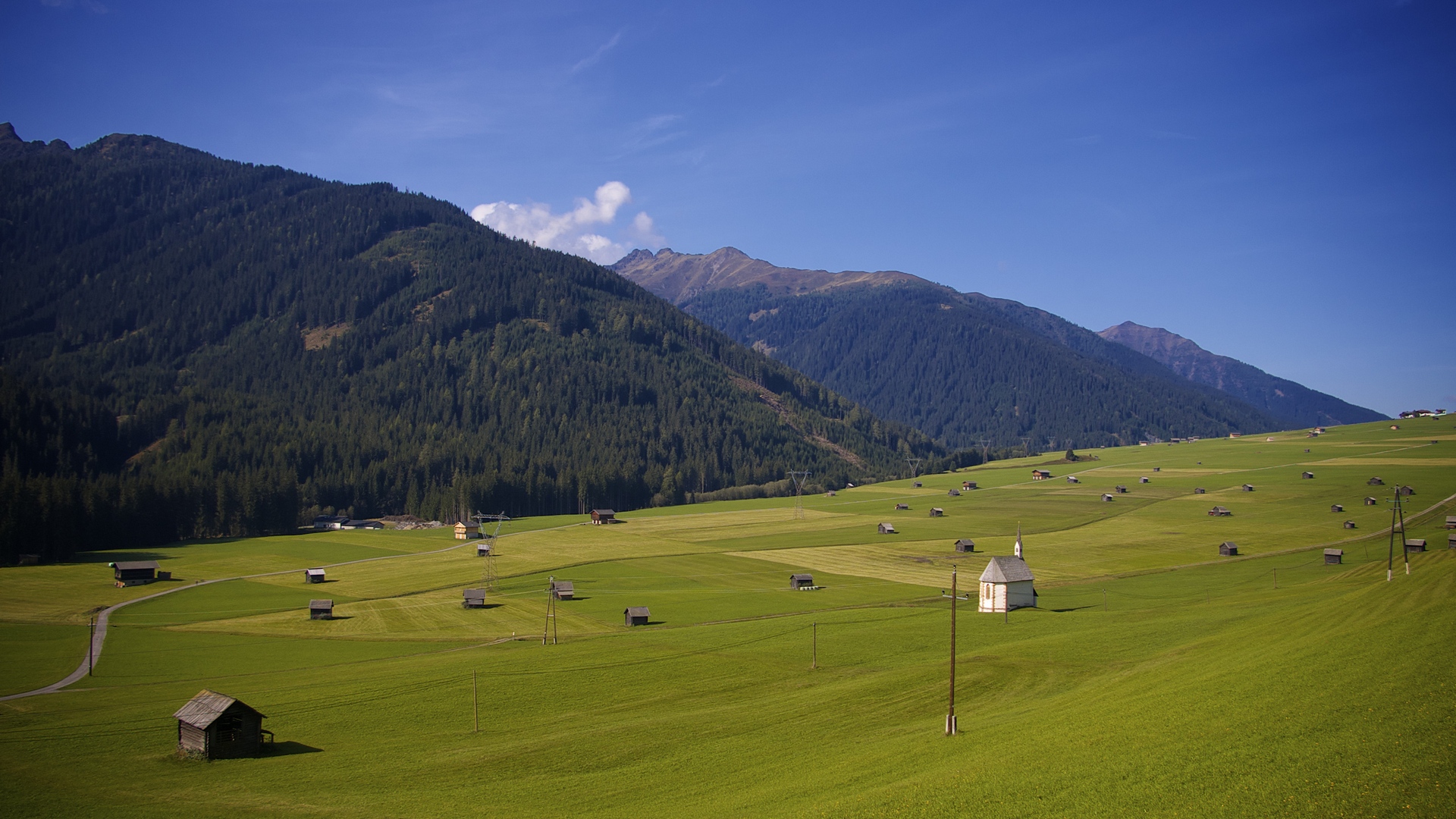 Description: A green field with a mountain in the background and a few houses in the distance with a road running through it.
