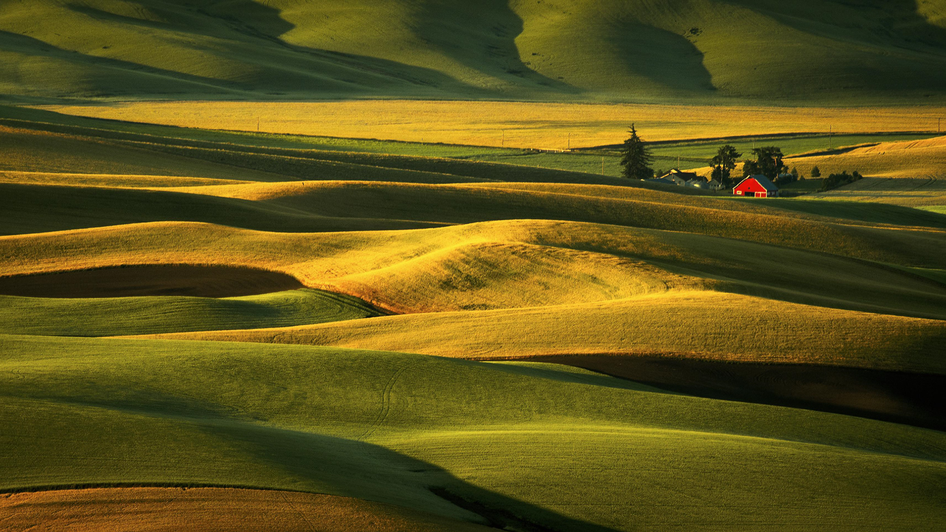 Description: A green field with a red house in the distance and hills in the background with trees and grass in the foreground.