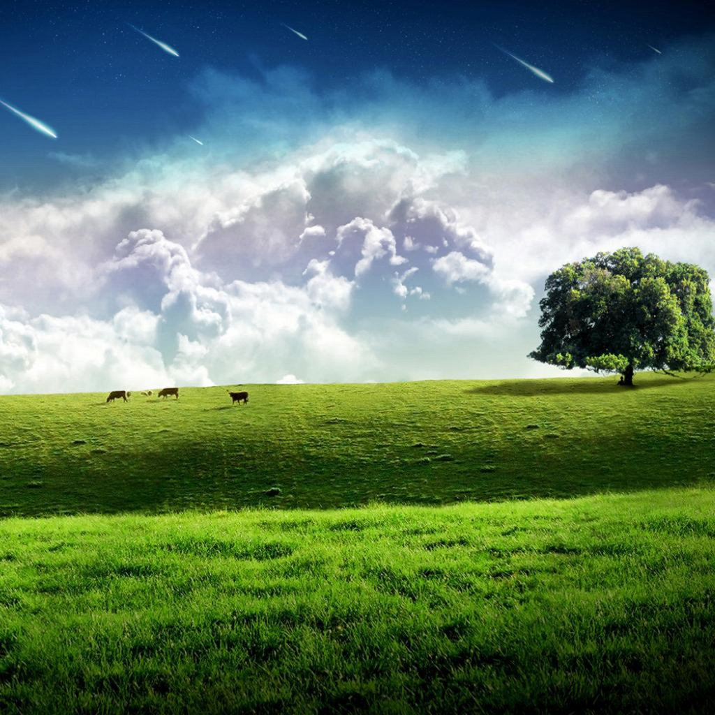 Description: A green field with a tree and some cows in it and a sky with clouds and stars above it.