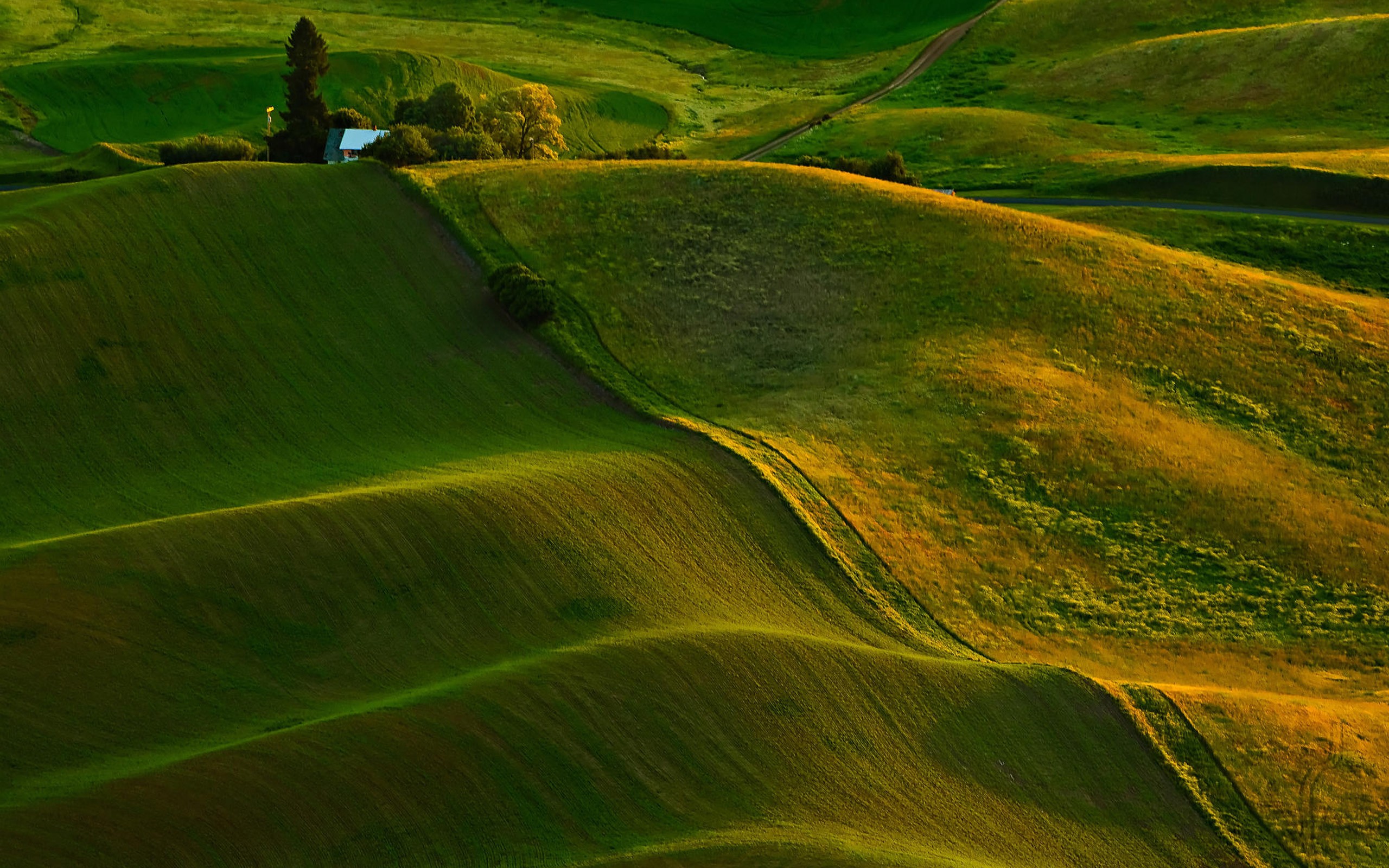 Description: A green field with a tree and a small house on it's side and a small pond in the middle.
