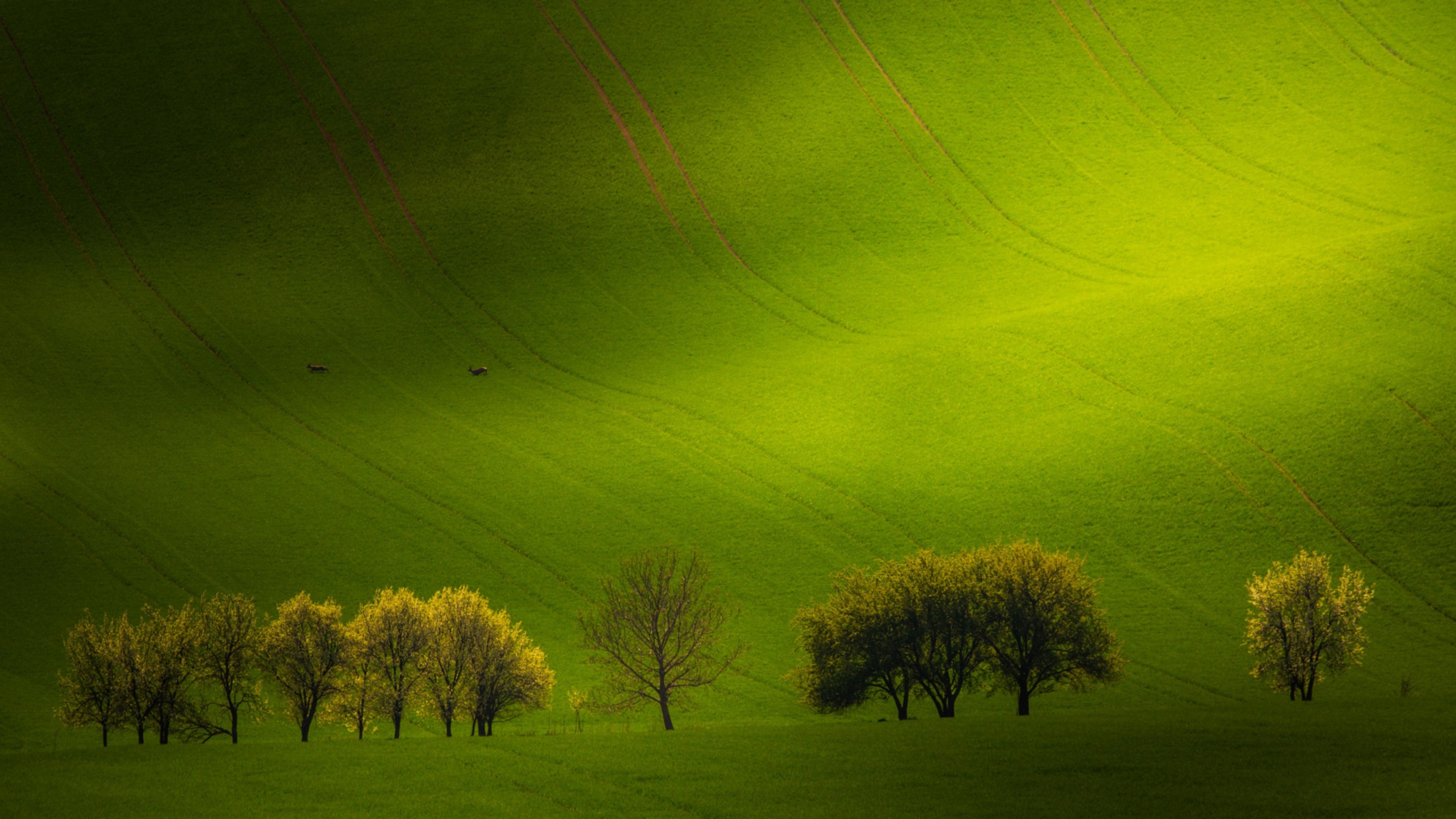 Description: A green field with trees and birds flying in the sky above it and a bird flying over the trees.