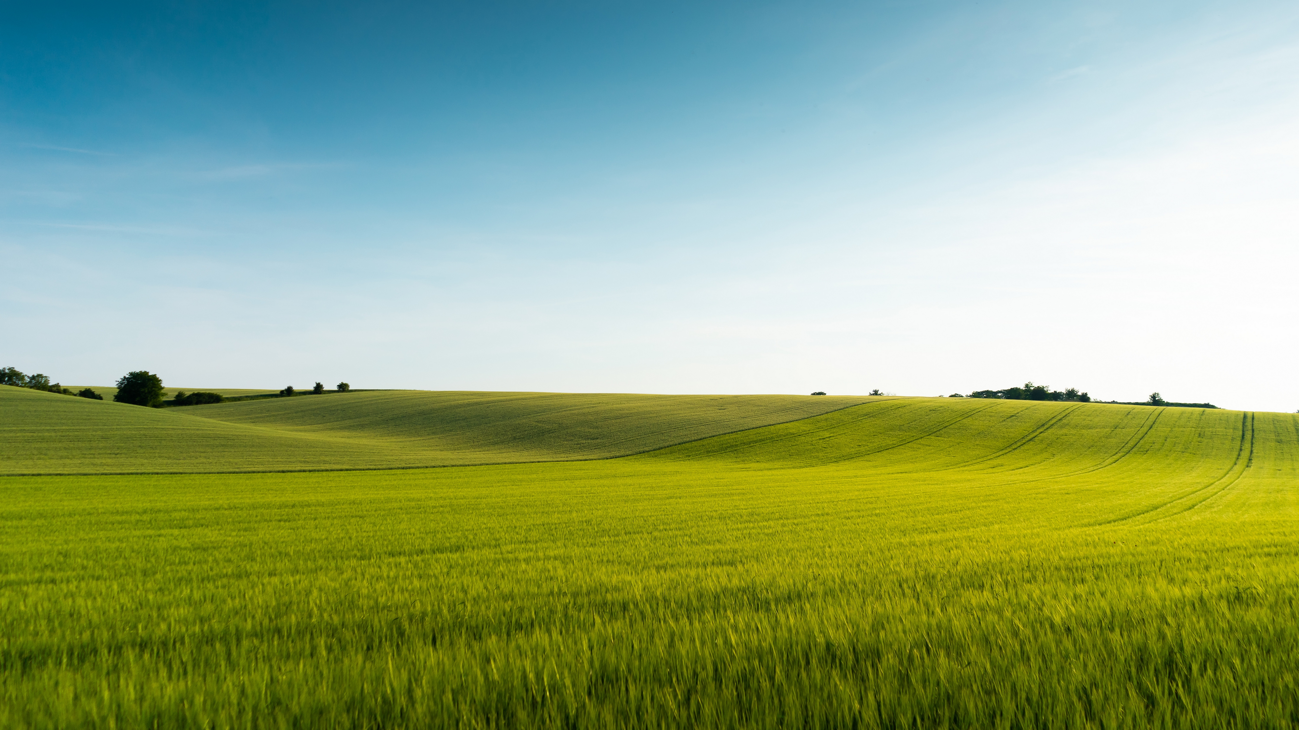 Description: A green field with trees in the distance and a blue sky in the background with a few clouds in the sky.