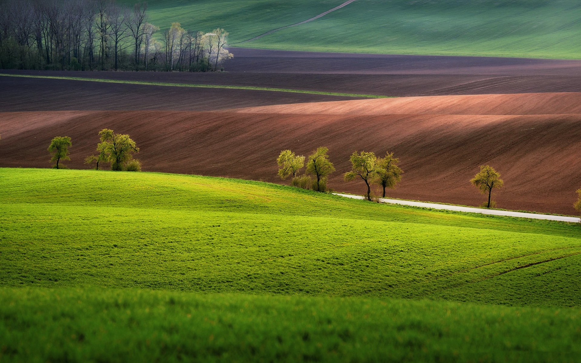 Description: A green field with trees and a dirt road in the distance with a green field in the foreground.