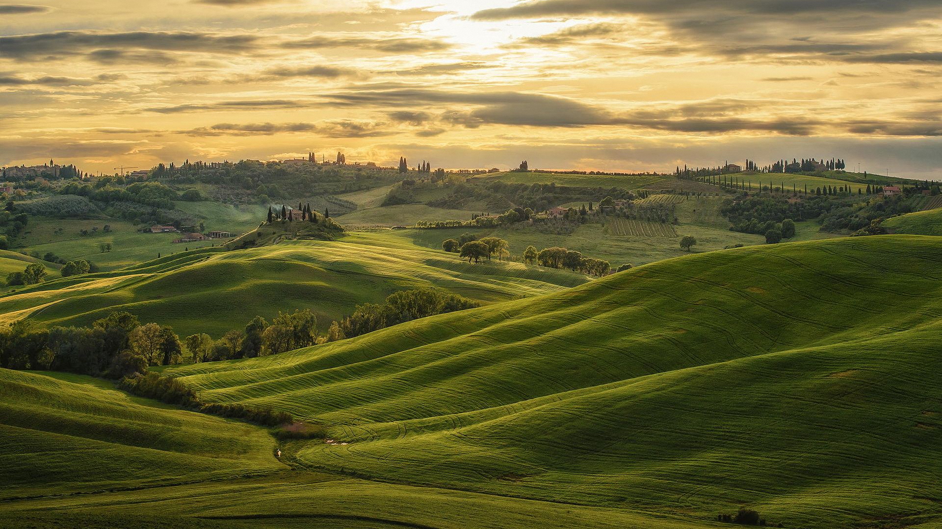 Description: A green field with trees and hills in the background at sunset with clouds in the sky above it and a few buildings on the horizon.