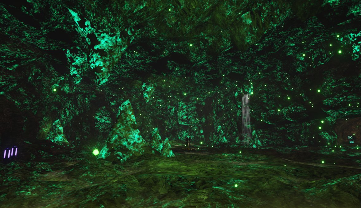 Description: A green forest with fireflies and a waterfall in the middle of it.