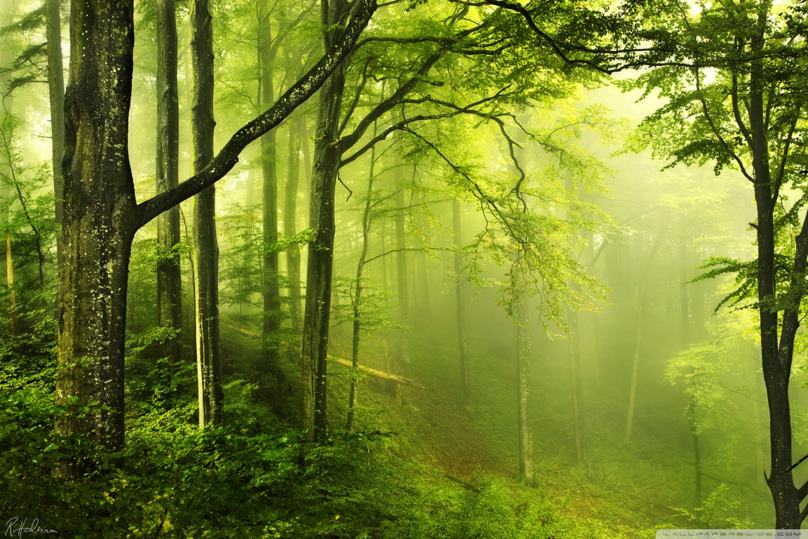 Description: A green forest with a path through it and lots of trees in the background with fog in the air.