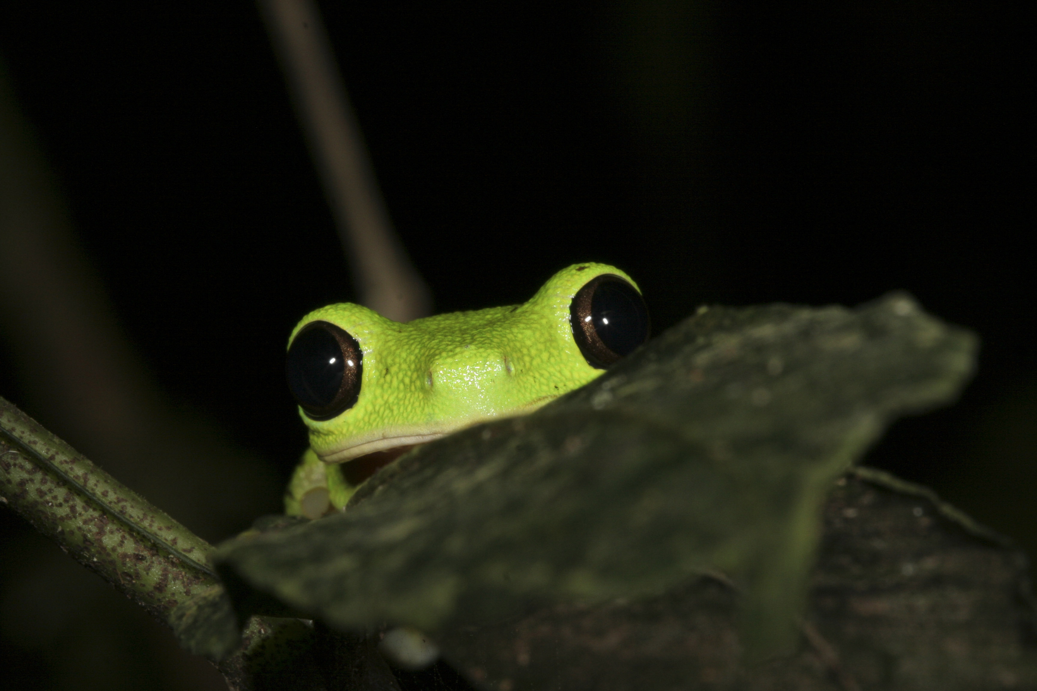 Description: A green frog with black eyes sitting on a leaf in the dark.