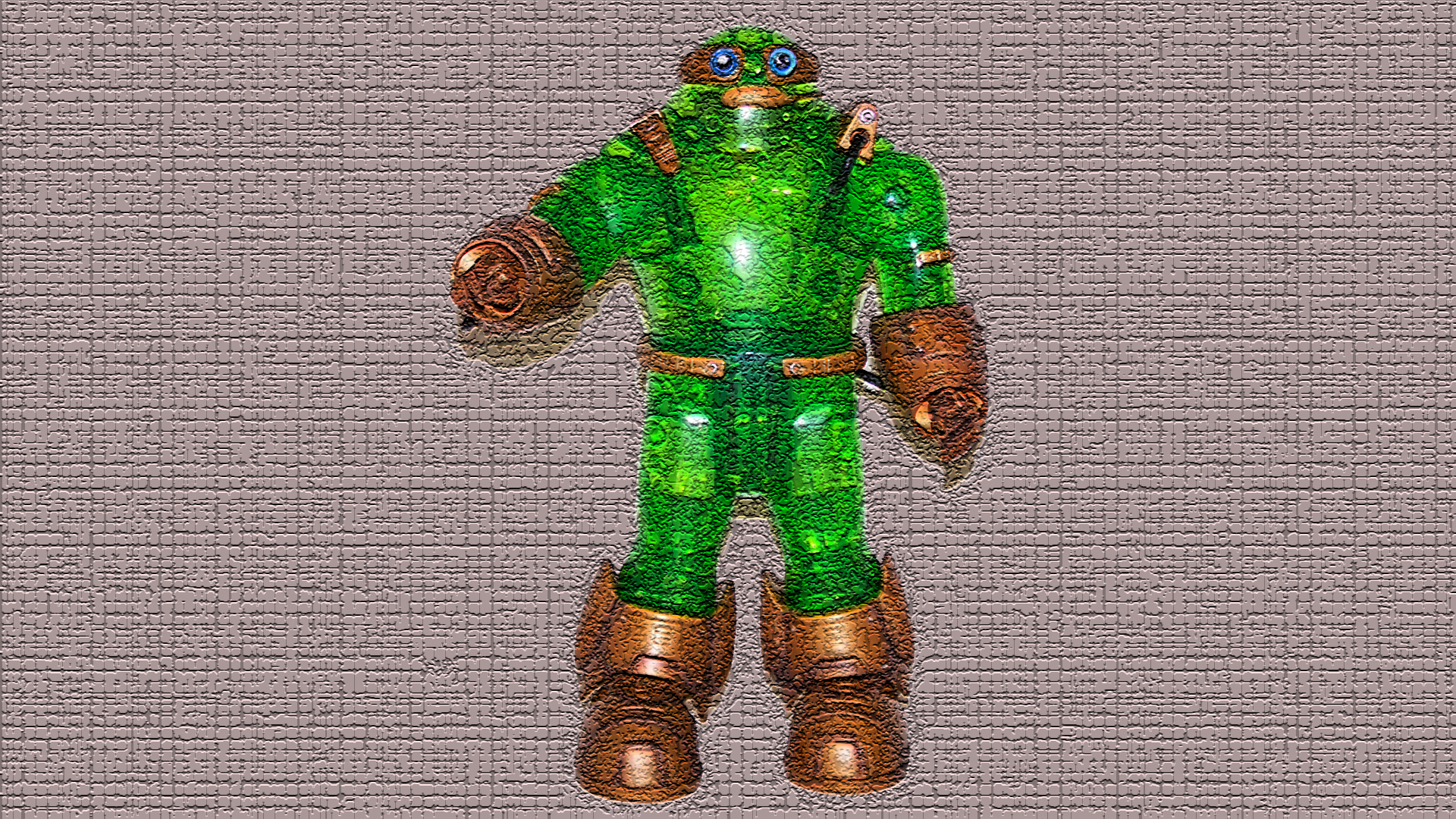 Description: A green and gold colored robot with a helmet and gloves on it's face and hands.