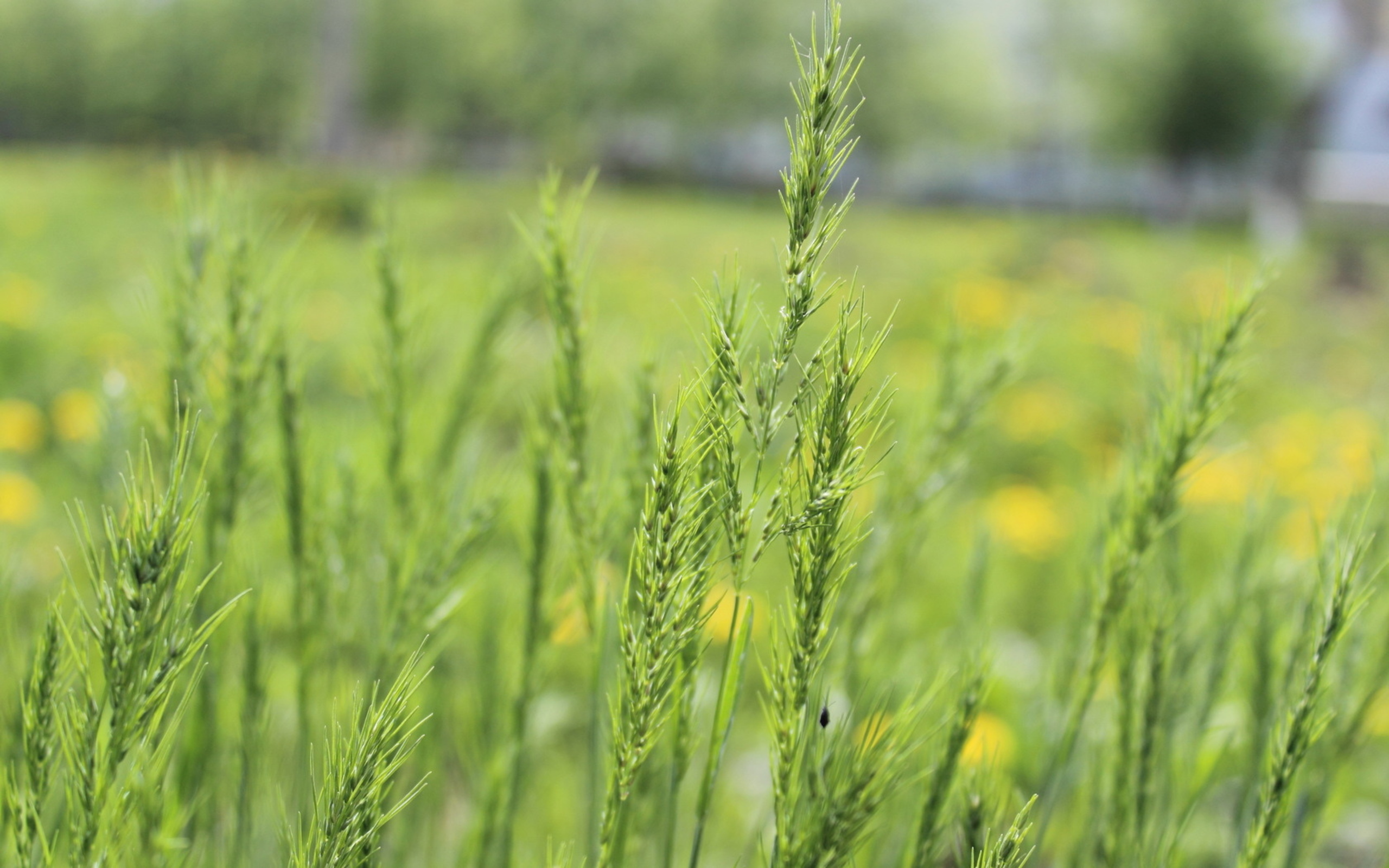 Description: A field of green grass with yellow flowers in the foreground and a house in the background with a blurry background.