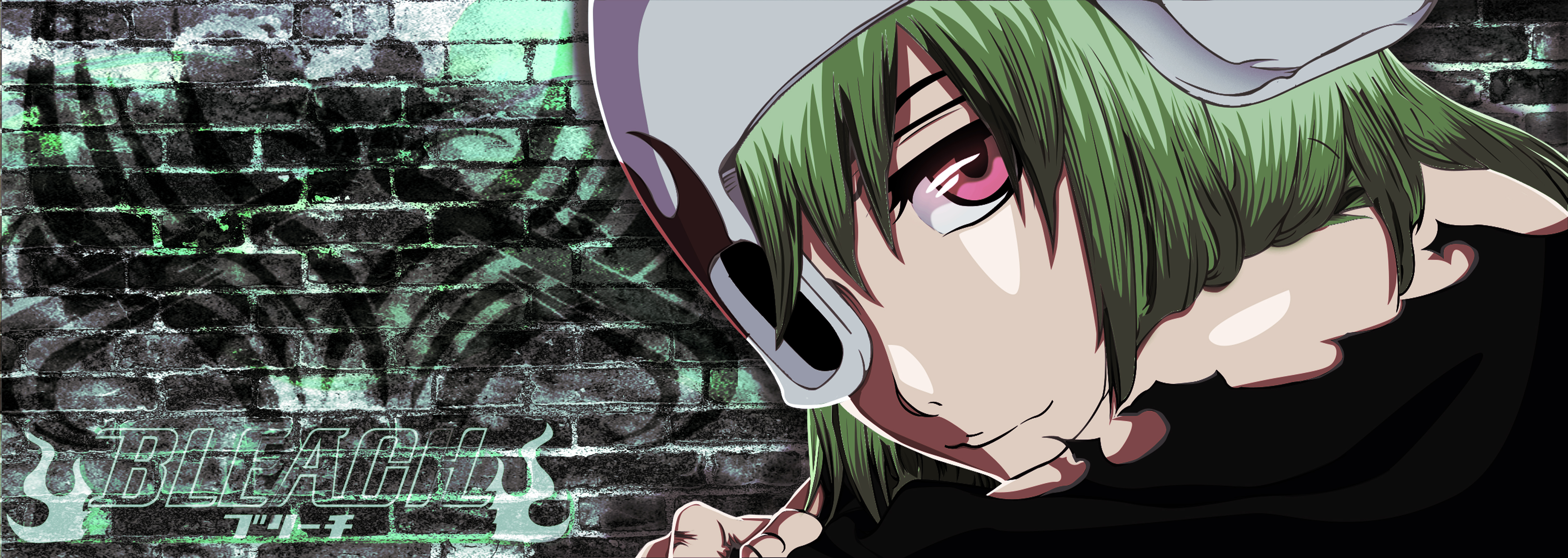 Description: A man with green hair and a black shirt and a brick wall with graffiti on it and a green and white hat.
