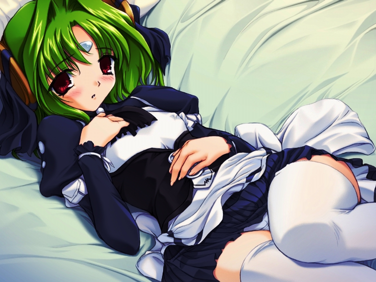 Description: A woman laying on a bed with green hair and a white shirt on her chest and a black and white shirt on her chest.