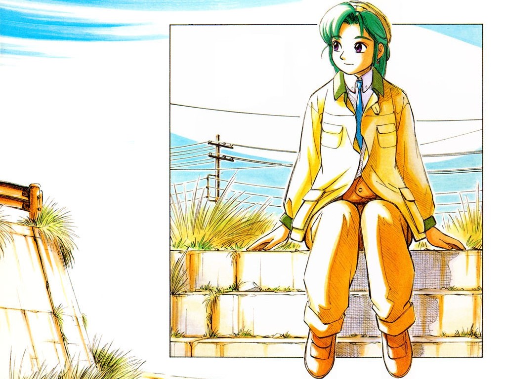 Description: A drawing of a person sitting on a ledge with a sky background and a building in the background with a telephone pole.
