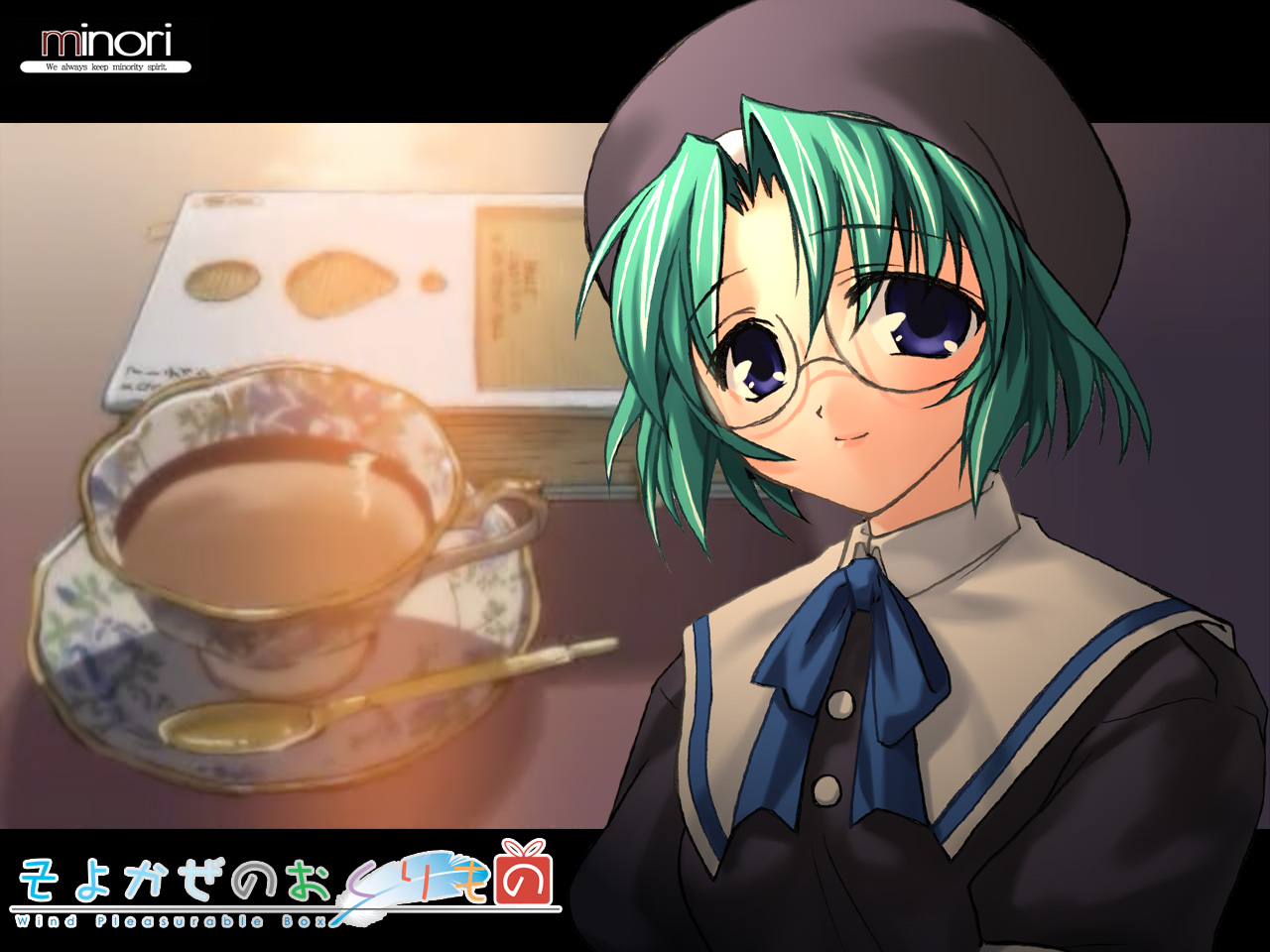 Description: A woman with green hair and glasses next to a cup of tea and a plate of food on a table.