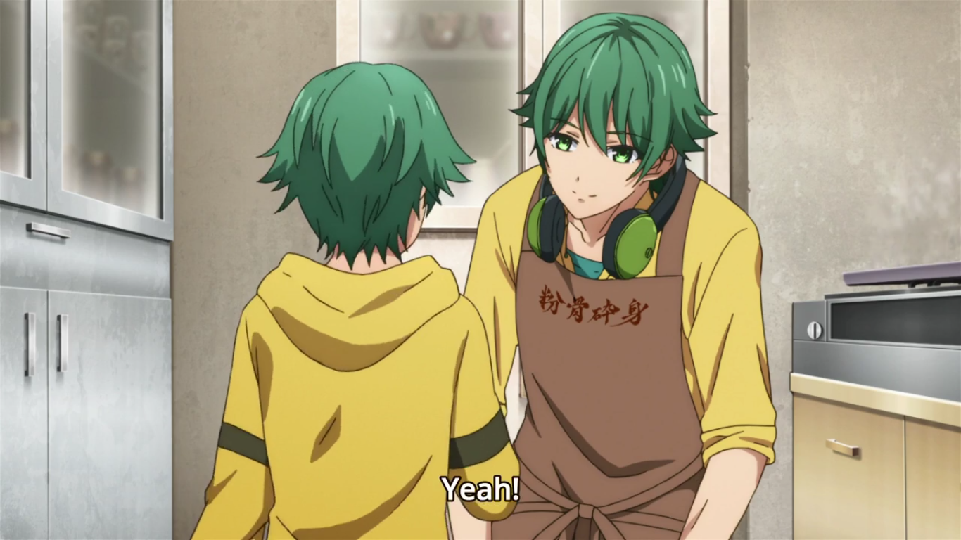 Description: A couple of people standing in a kitchen next to each other with green hair and green eyes and green eyes.