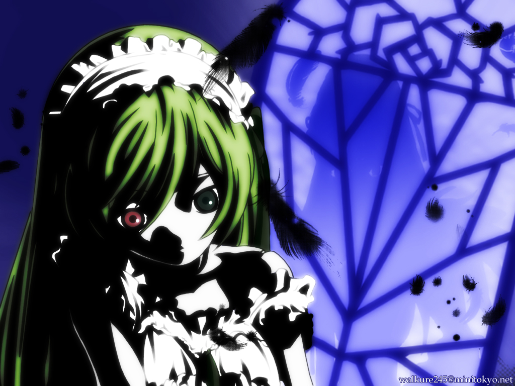 Description: A anime girl with green hair and black and white dress and a black and white cat on her shoulder.