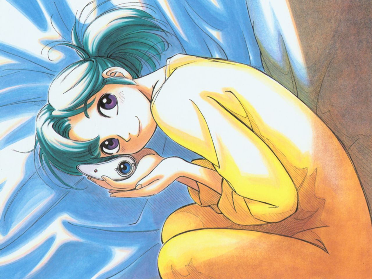 Description: A woman with green hair and a yellow dress is holding a white cat in her hands and looking at the camera.