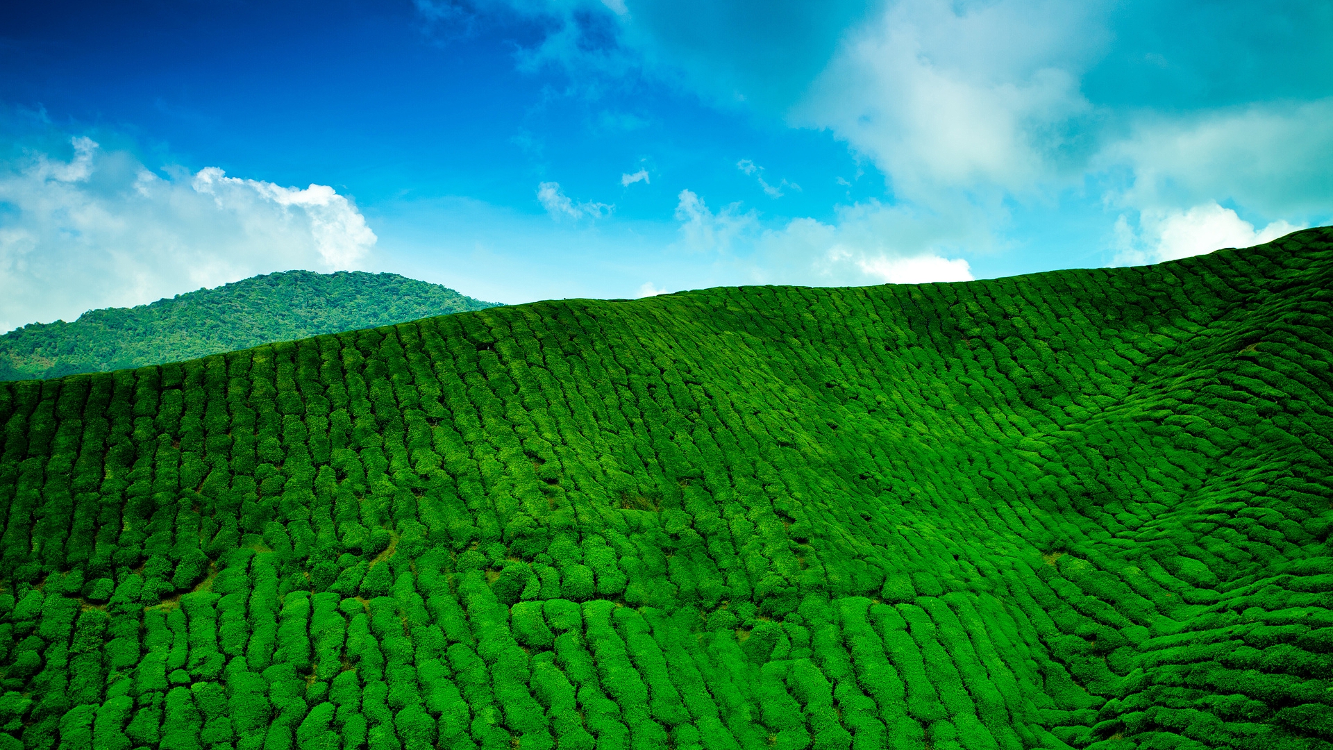 Description: A green hill with a blue sky in the background and clouds in the sky above it.
