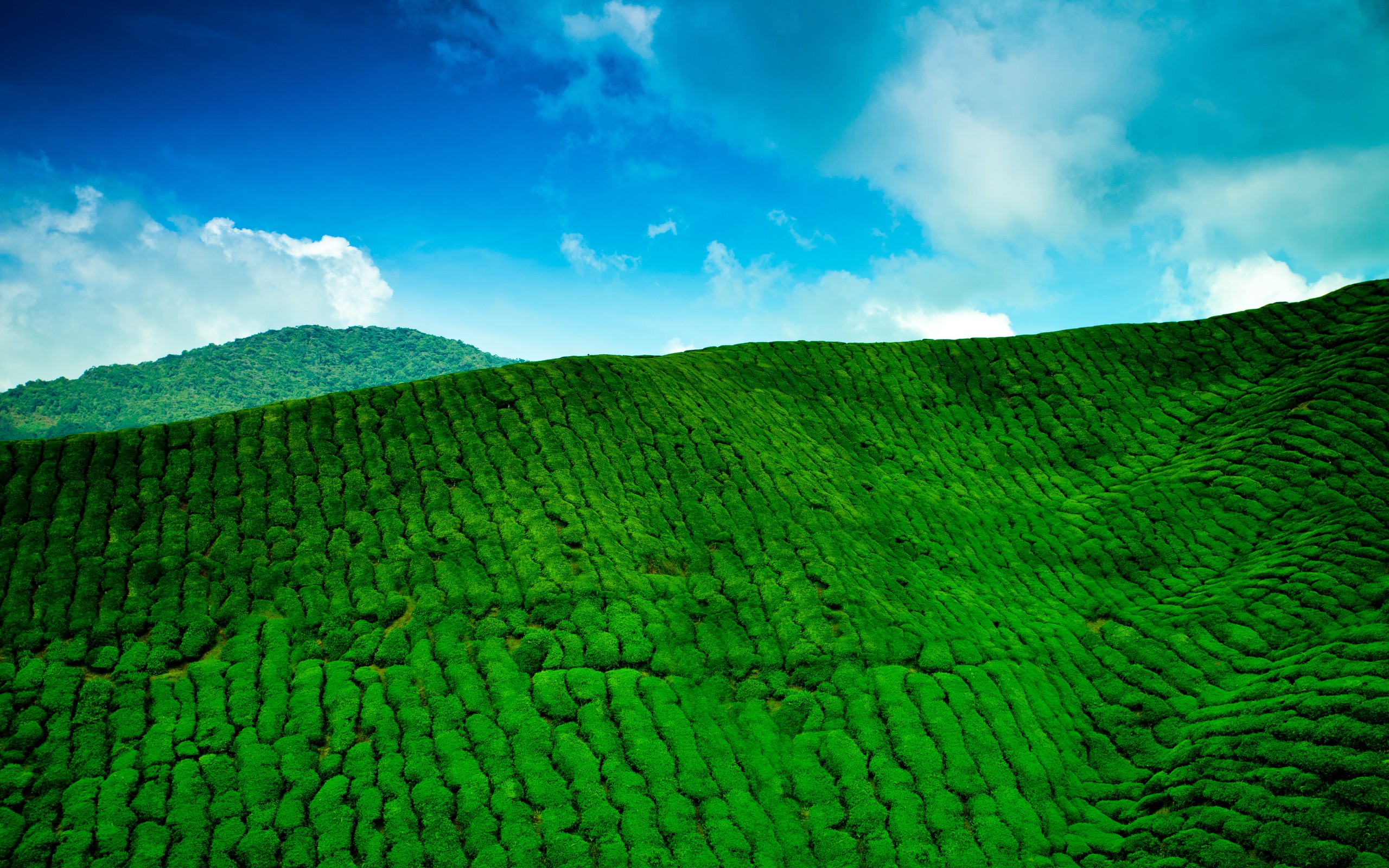 Description: A green hill with a blue sky in the background and clouds in the sky above it.