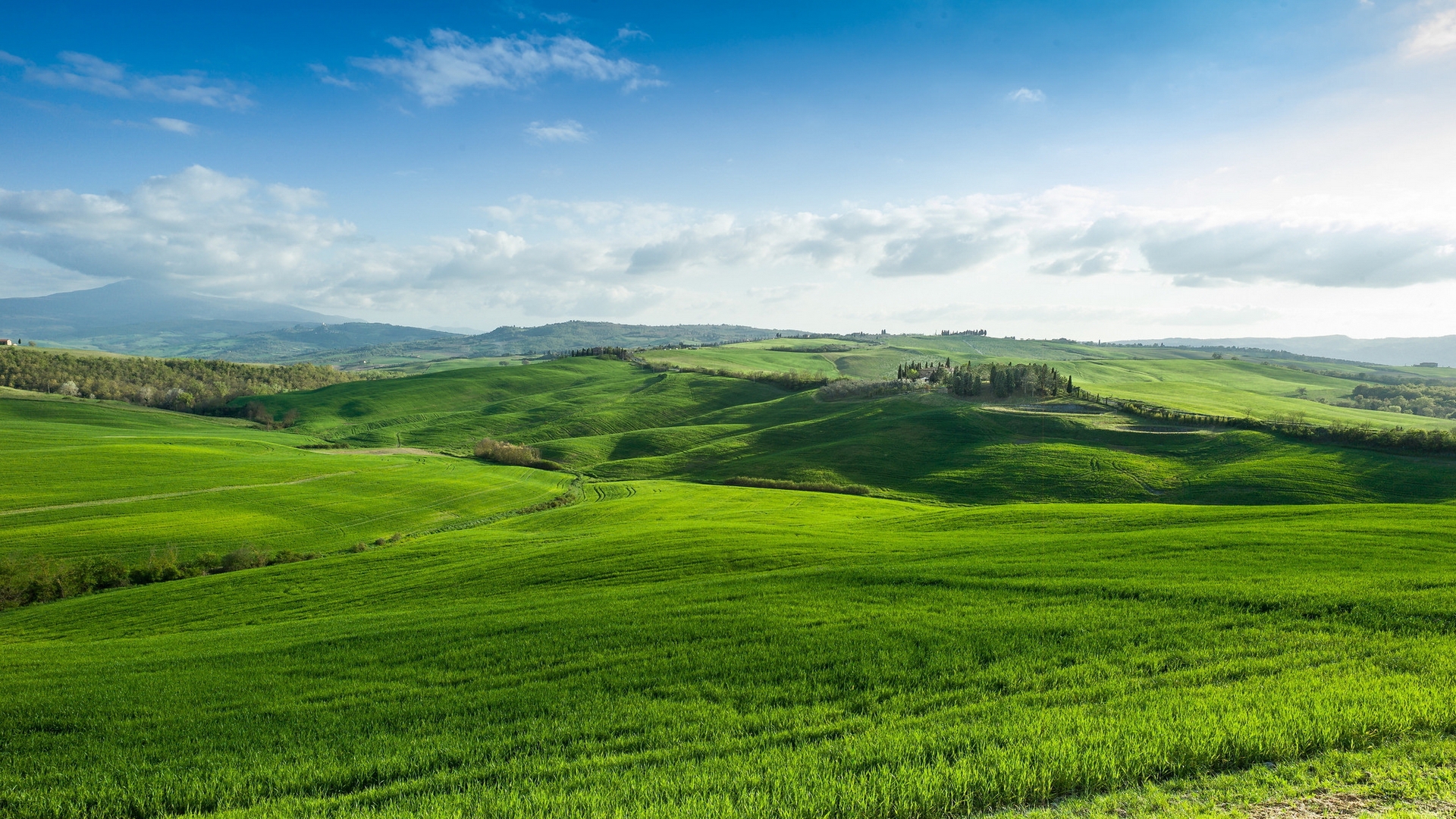 Description: A green field with hills in the distance and clouds in the sky above it and a blue sky with white clouds.