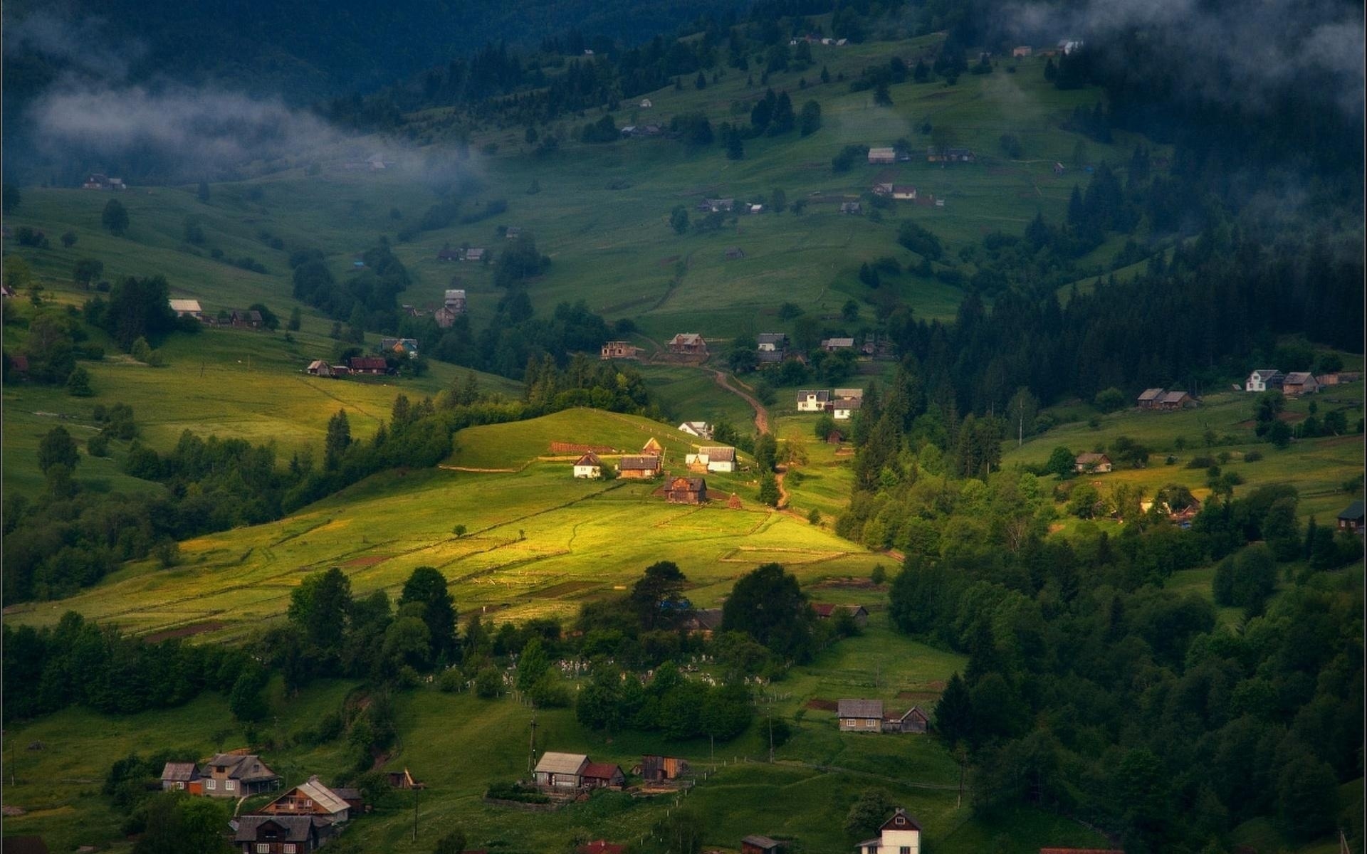 Description: A green hillside with houses on it and clouds in the sky above it and a few trees on the hillside.
