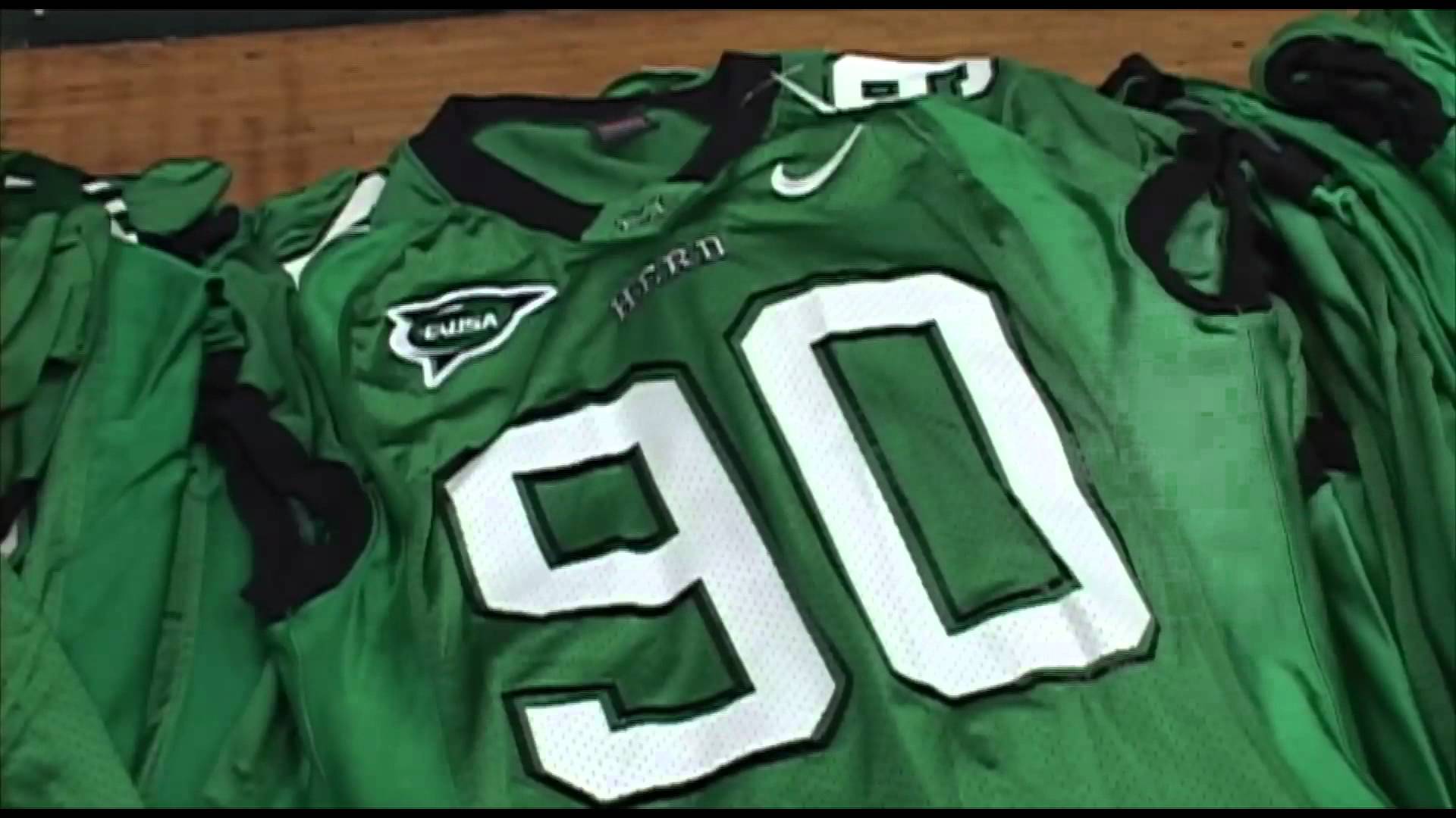 Description: A group of green jerseys sitting on top of a wooden bench next to each other on a wooden floor.