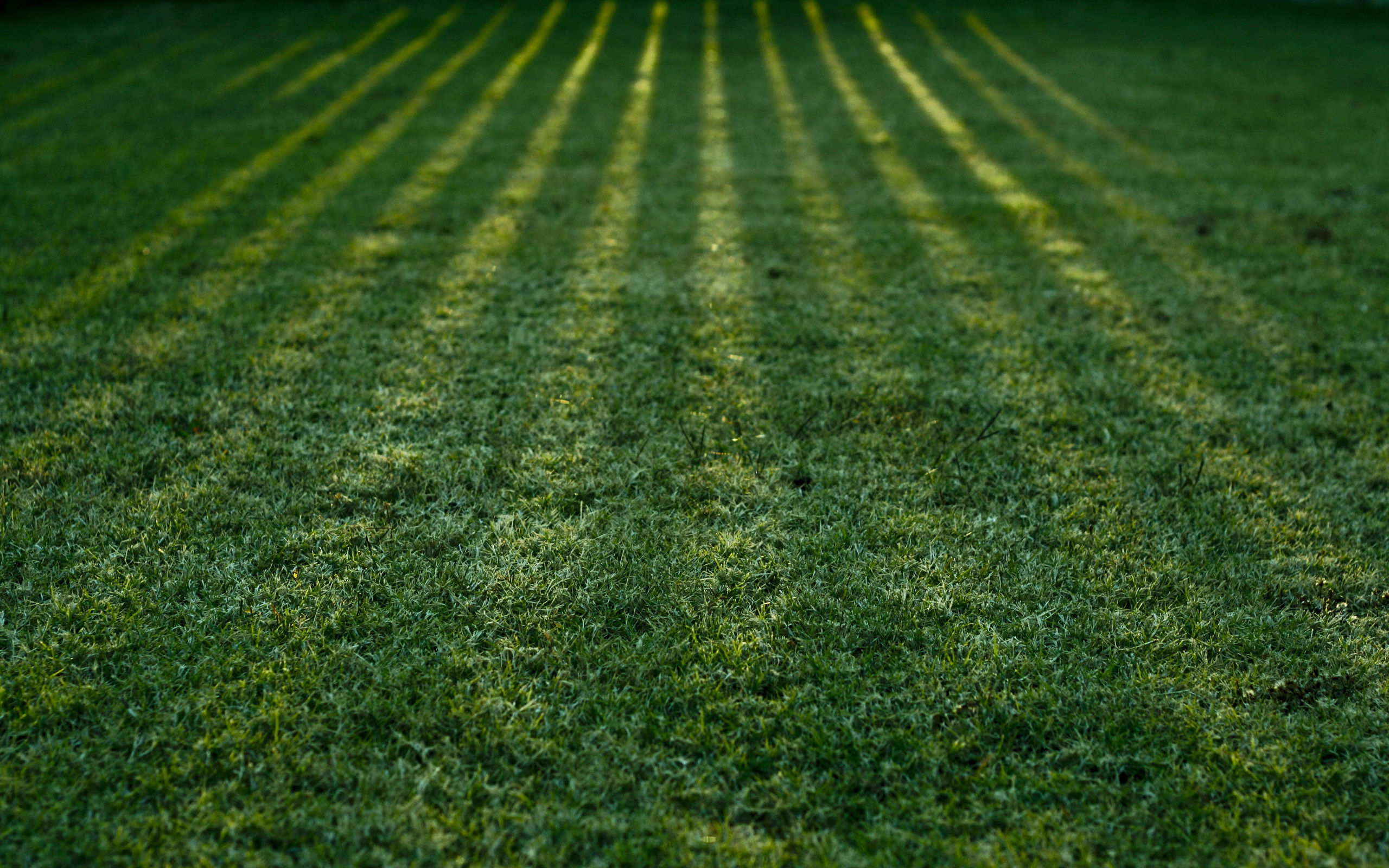 Description: A green lawn with lines of grass in the middle of it and a tree in the background with a house in the distance.