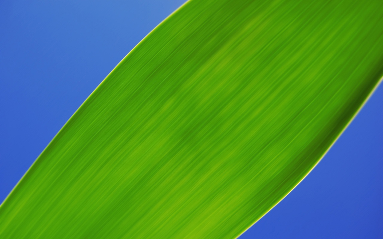 Description: A green leaf with a blue sky in the background is a close up view of the leaves of a plant.