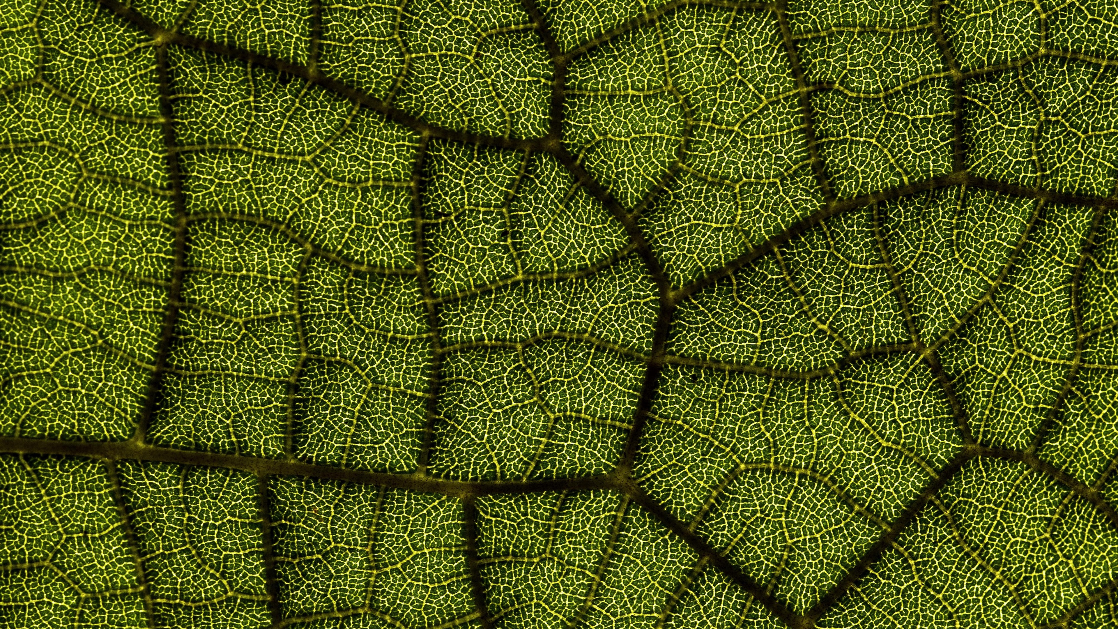 Description: A close up of a green leaf with a black line on it's side and a white line on the top of the leaf.