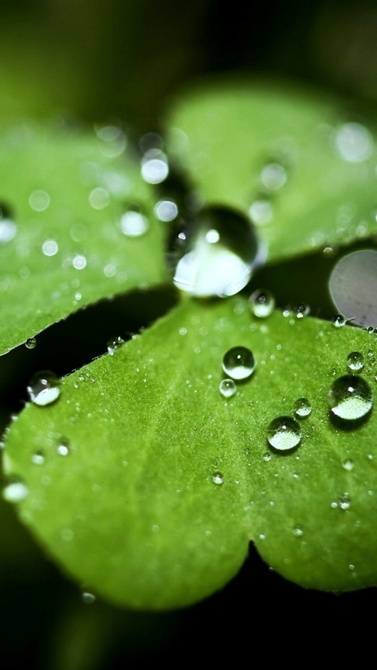 Description: A green leaf with water droplets on it's leaves and a black background with a white border around it.
