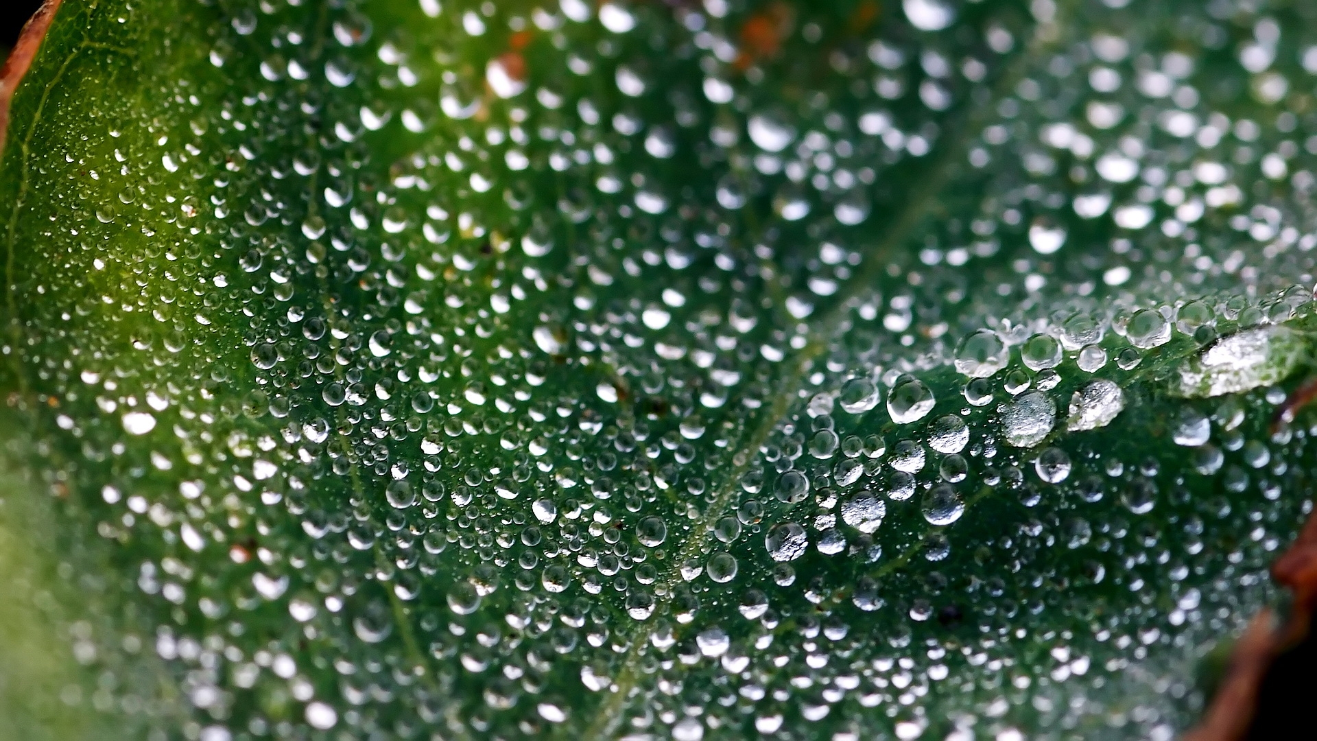 Description: A close up of a green leaf with water droplets on it's leaves surface and a black background.