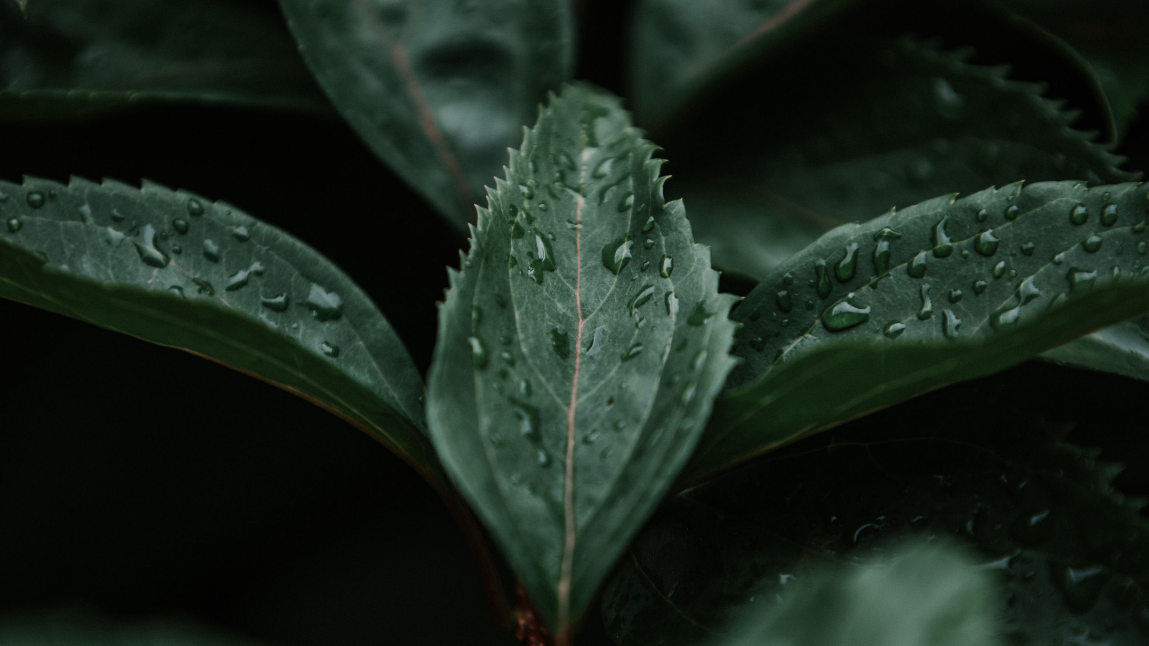 Description: A close up of a green leaf with water droplets on it's leaves and leaves are in the background.