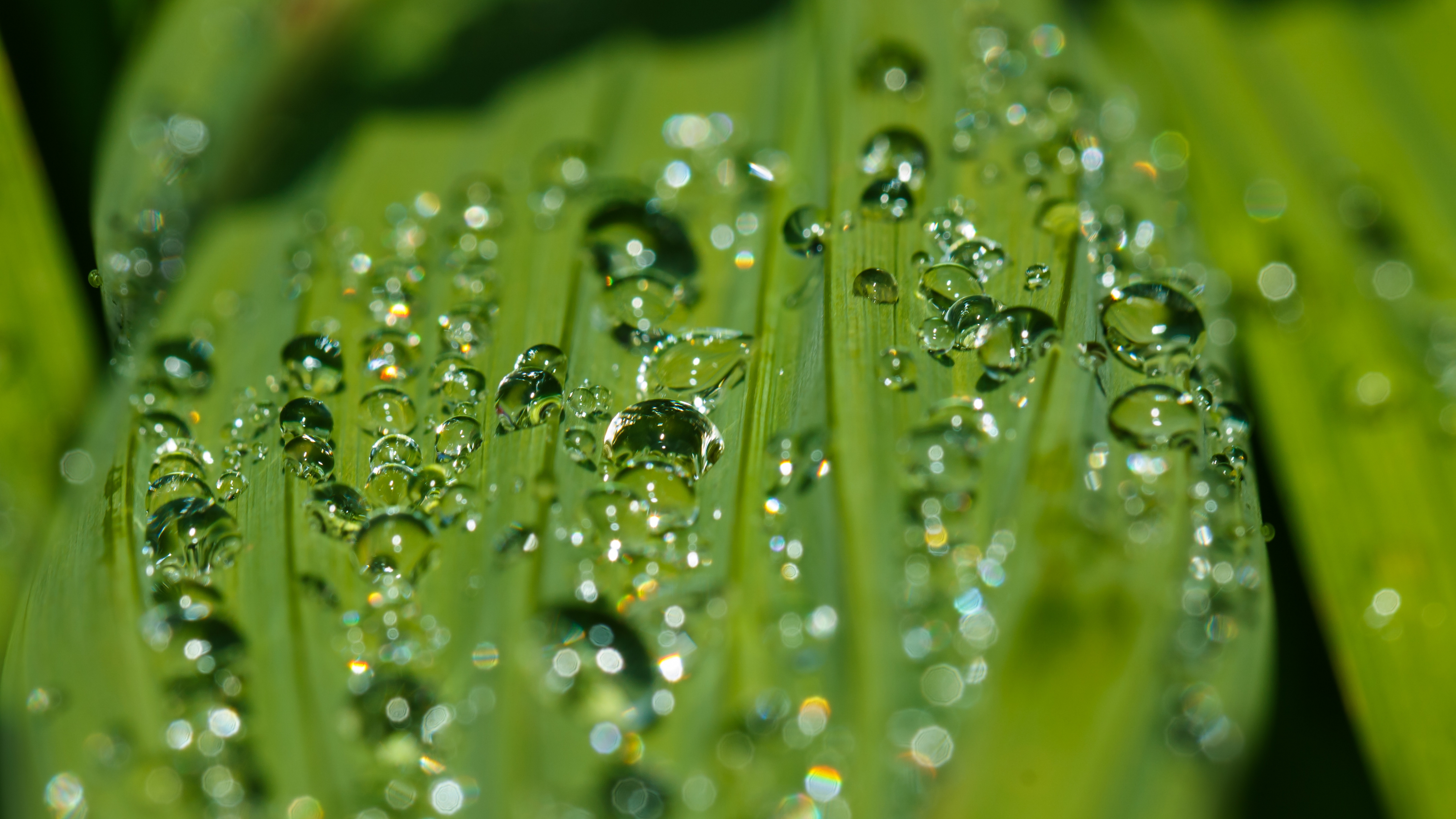 Description: A close up of a green leaf with water droplets on it's leaves and leaves surrounding it.