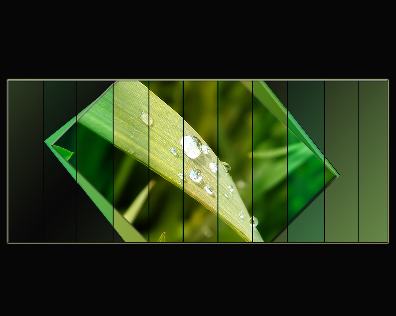 Description: A picture of a green leaf with drops of water on it's leaves and a black background with a green arrow.