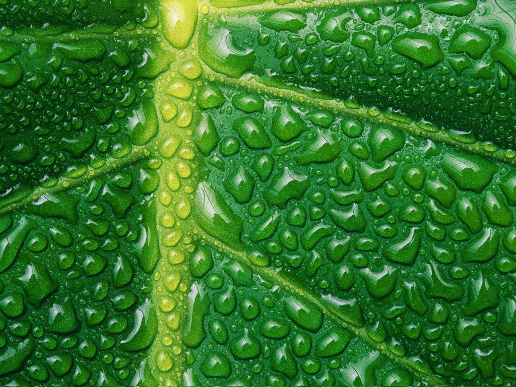 Description: A close up of a green leaf with water drops on it's leaves surface.