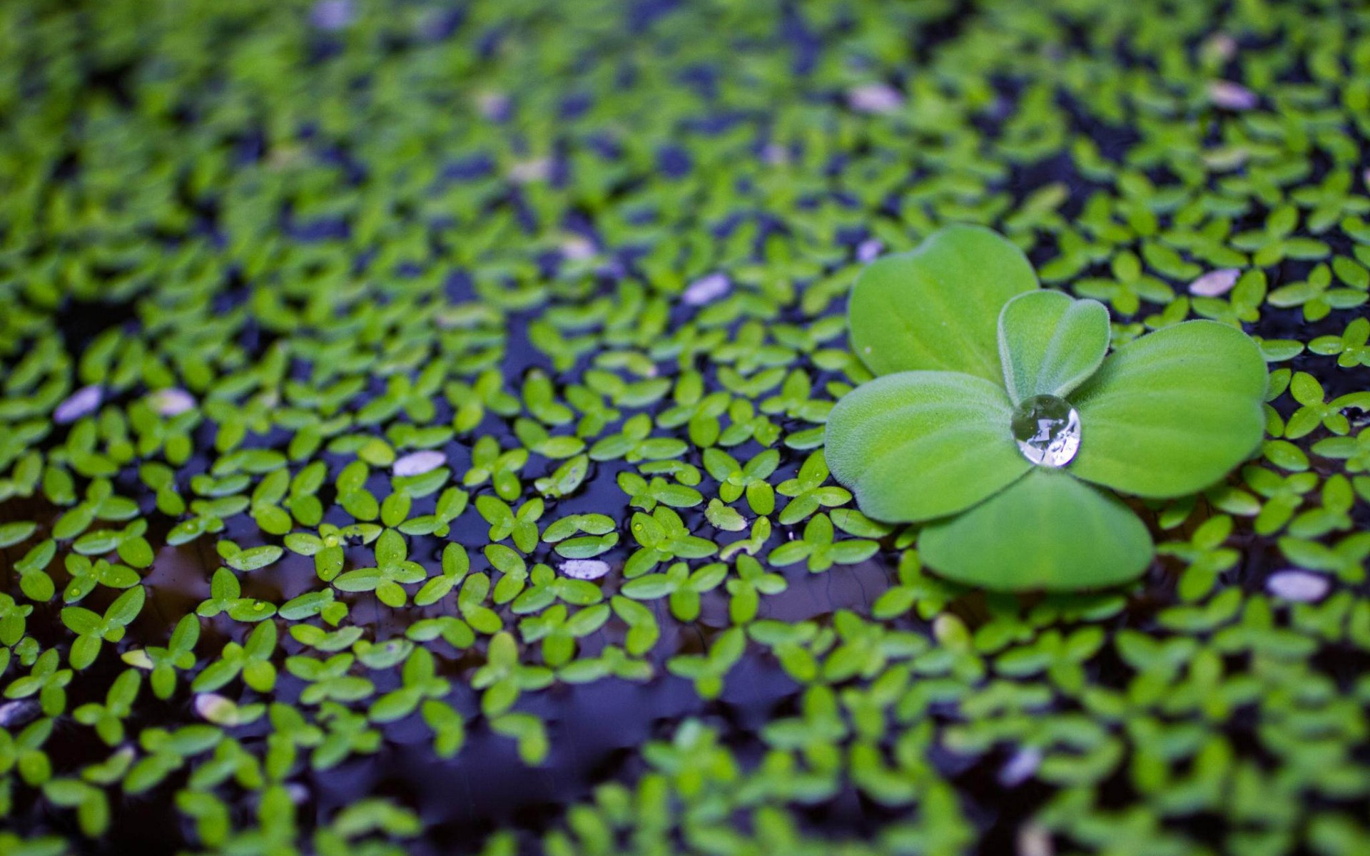 Description: A green leaf with a water drop on it is floating on a pond of water lilies and other plants.