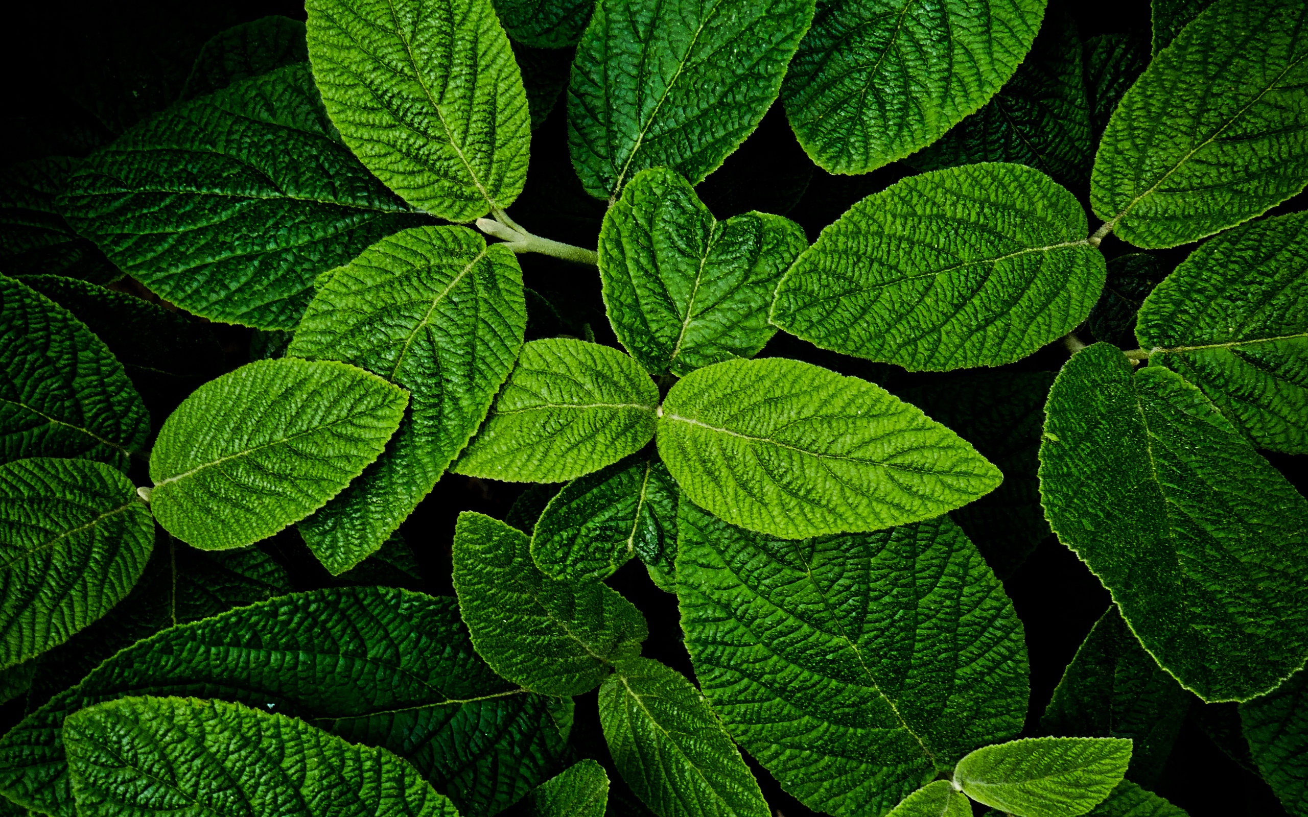Description: A close up of a green leafy plant with lots of leaves on it's sides and a black background.